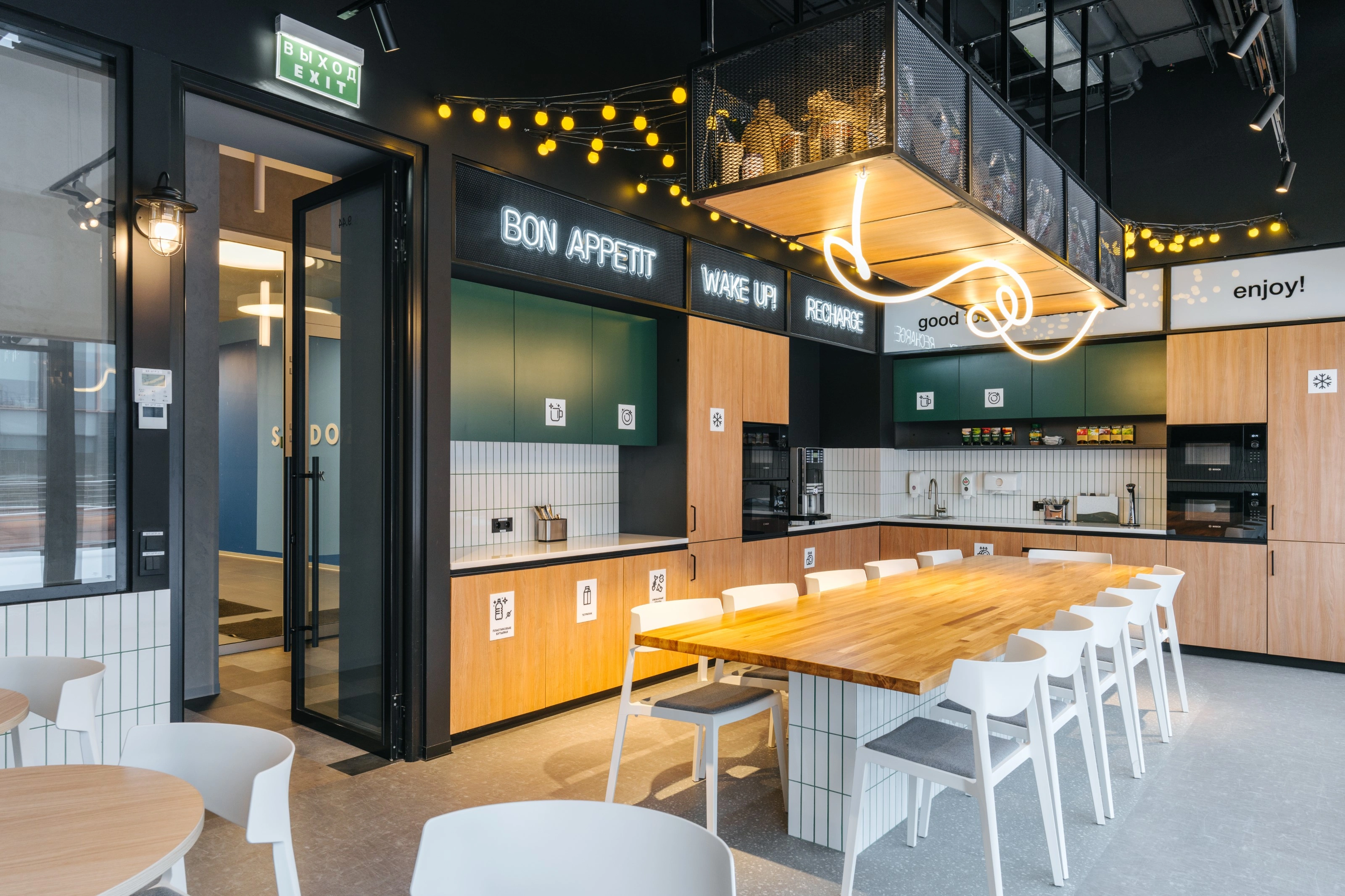 Кафетерии имитируют стритфуд маркеты с присущими им индустриальными конструкциями, неоновыми светильниками, необработанным деревом и бетонными полами — можно представить, что вы каждый раз ходите на обед в разные заведения.