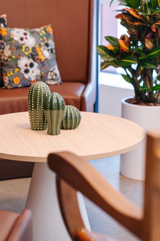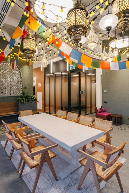 Поскольку у компании ещё есть филиалы в Индии, Швейцарии и Мексике, мы оформили в офисе три отдельные зоны в тематике этих стран — выполнили отделку в стилизованных местных образах.