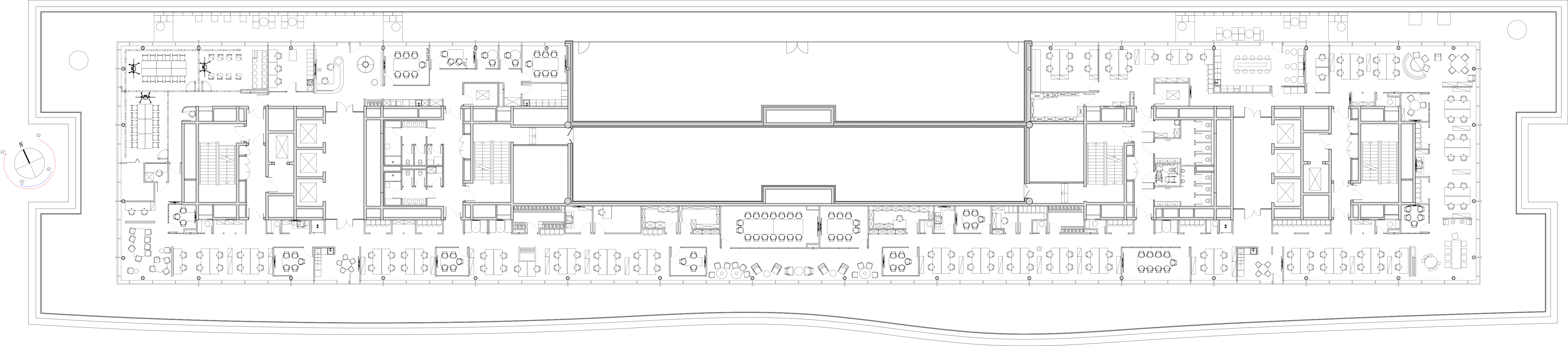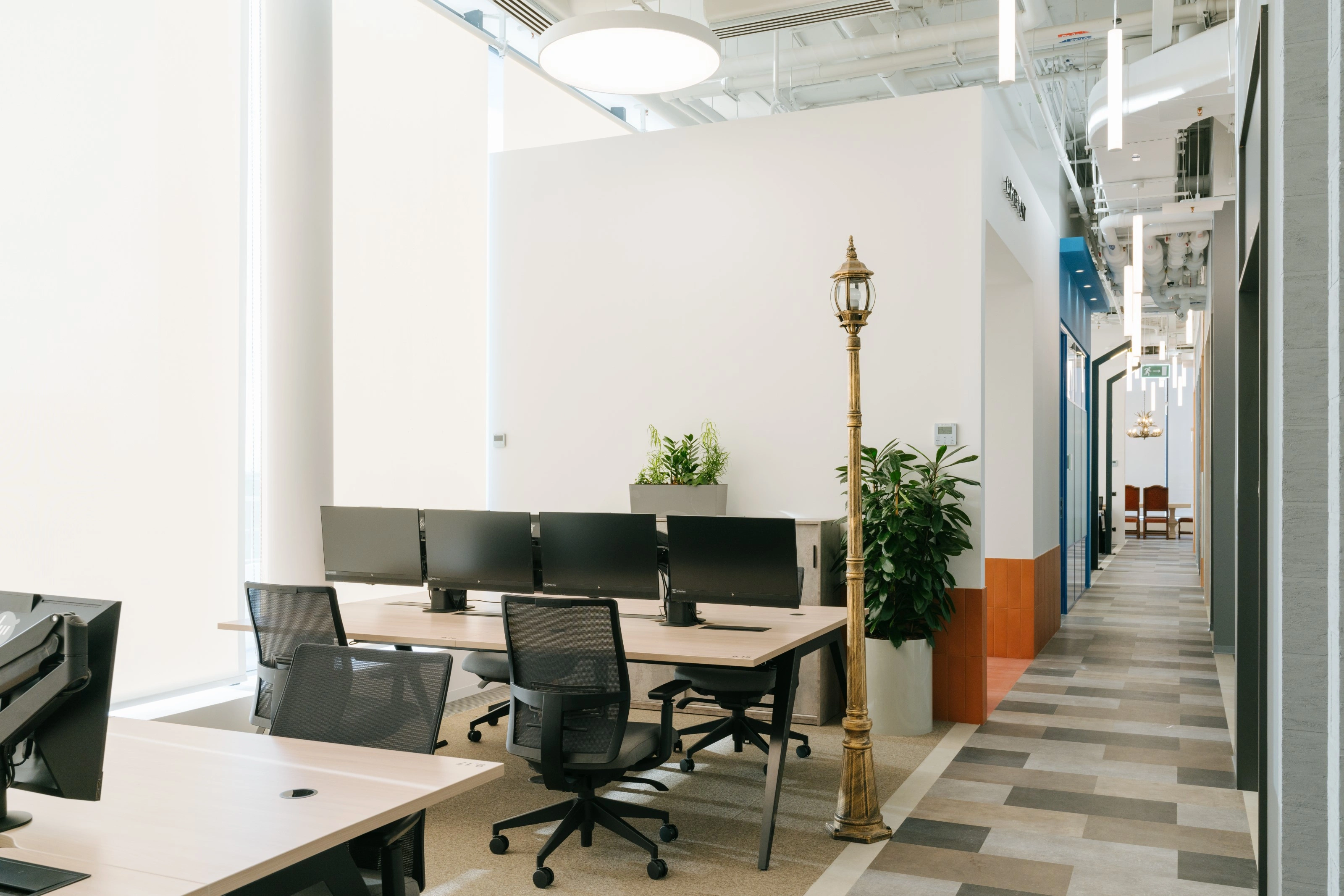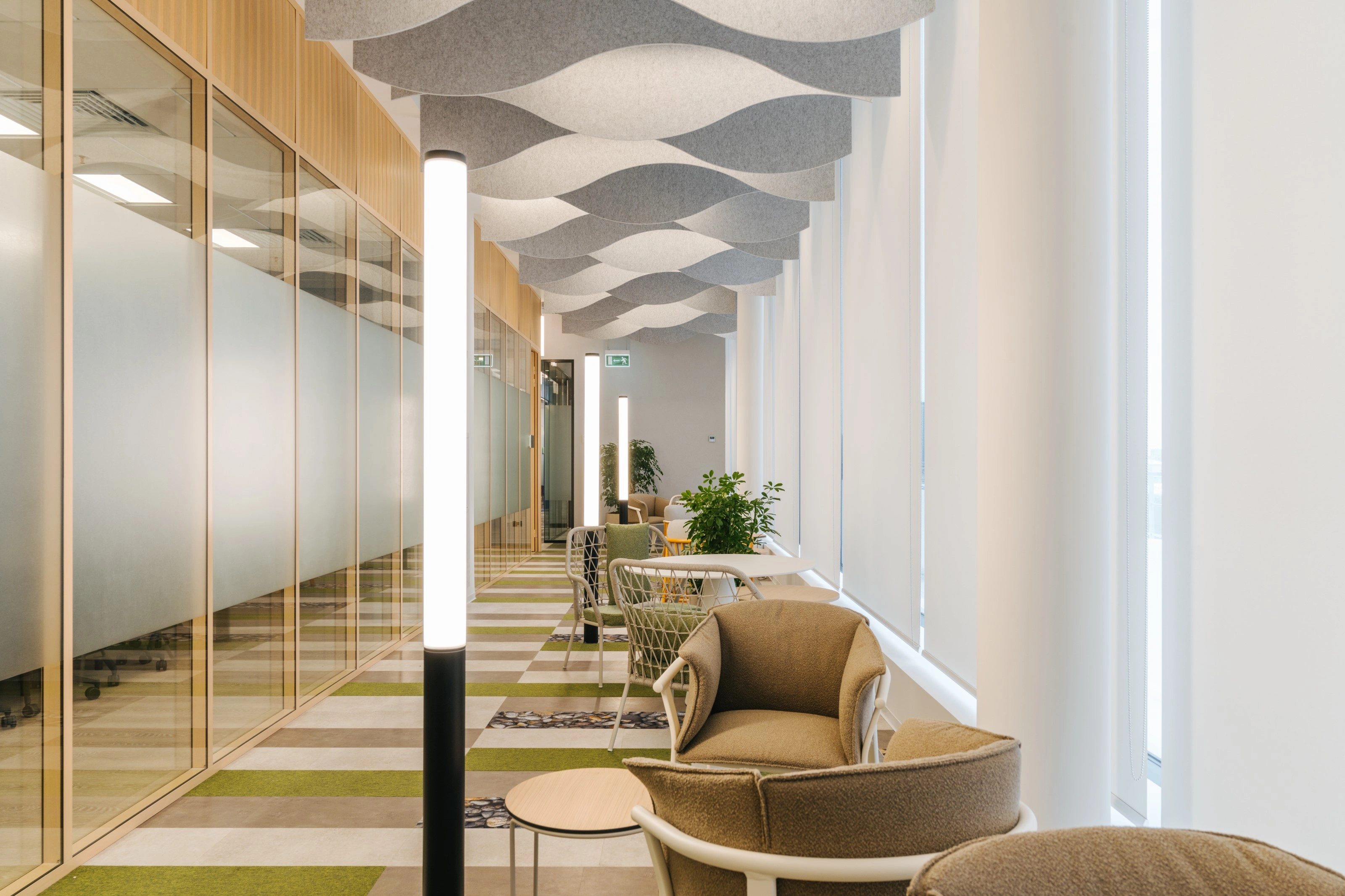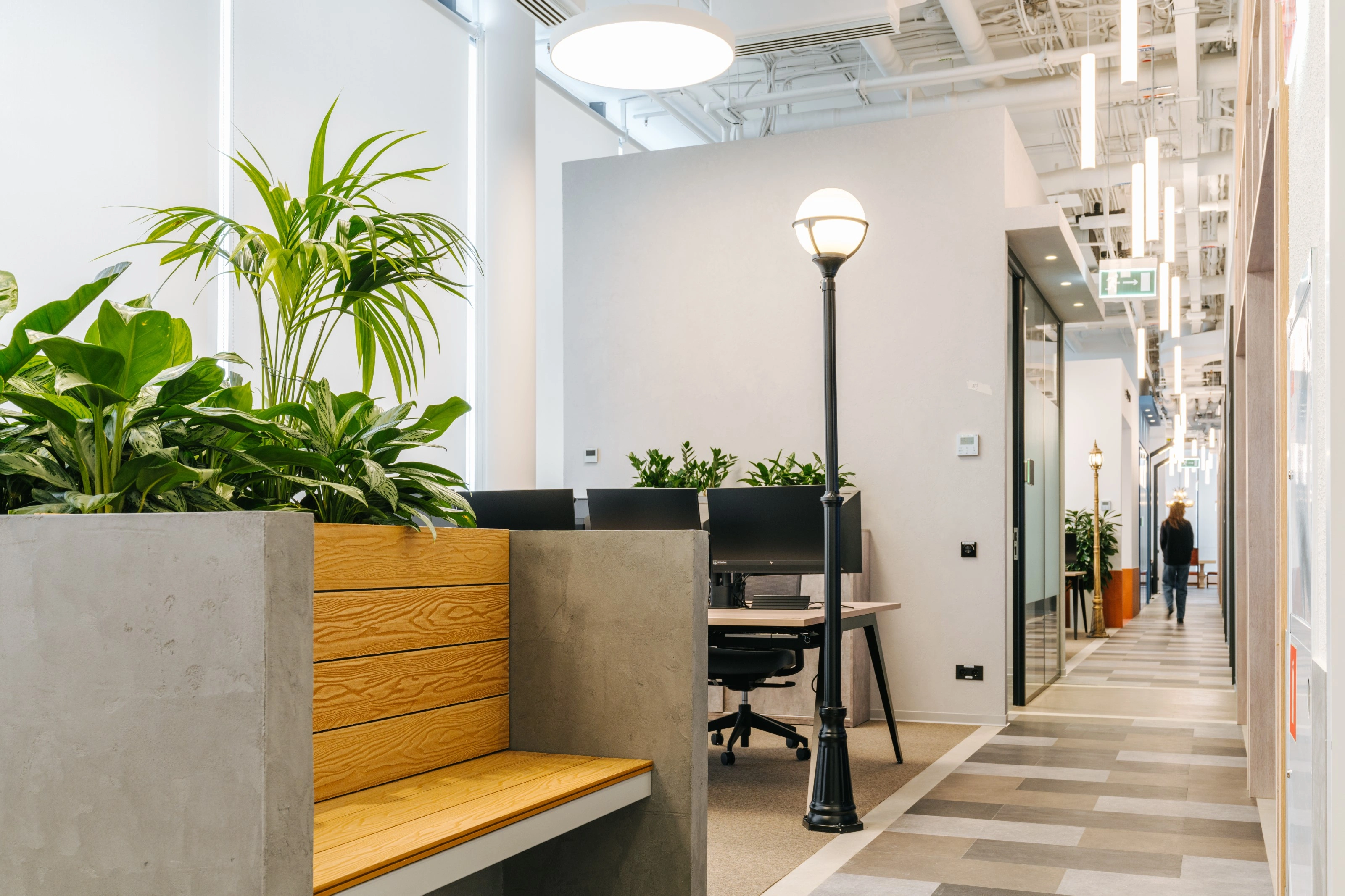 Кольцевой коридор офиса превратился в главную пешеходную улицу: пол выложен тротуарным камнем с бордюром, по бокам стоят скамейки для отдыха, уличные фонари и зелёные насаждения. Озеленение живыми растениями добавляет свежести в интерьер, а фонари выполняют не только декоративную функцию, но и дополнительно освещают пространство, позволяют регулировать теплоту и яркость света в офисе.