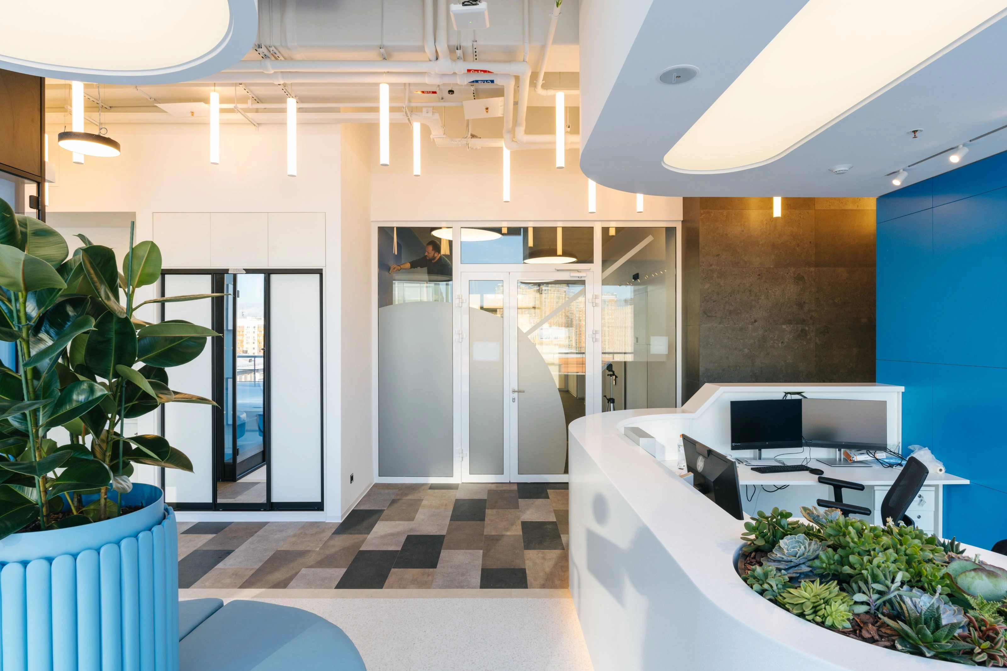 Рецепцию мы выполнили в футуристичном стиле и в сине-белых корпоративных цветах компании. Светлая цветовая гамма создаёт простор, который гармонирует с уличной атмосферой, сине-белые цвета ассоциируются с облаками среди ясного неба, а озеленение дополняет городской пейзаж.