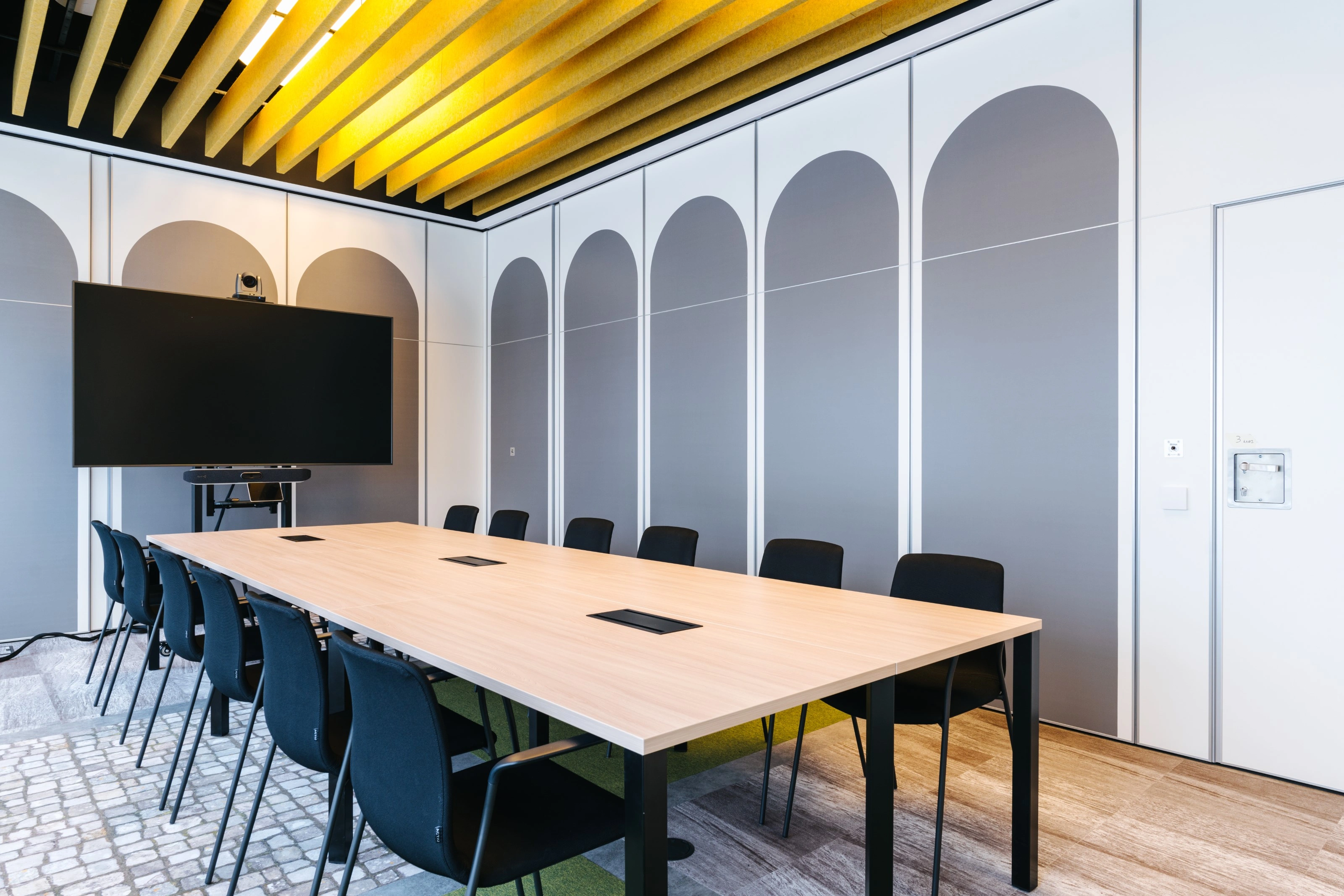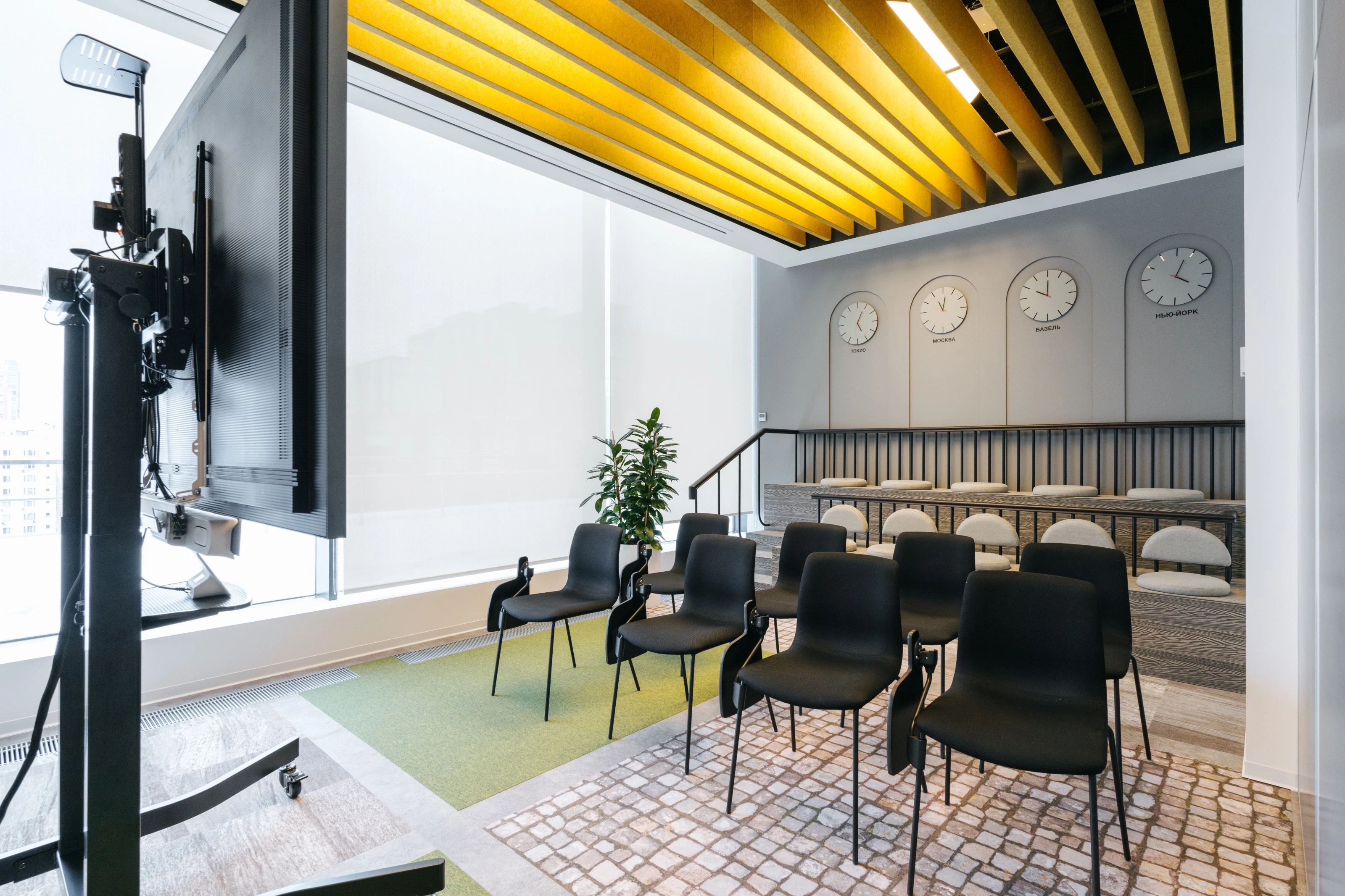 Для проведения общих мероприятий на площади установлены трибуны с мягкими сидениями. А раздвижные перегородки в виде аркады при необходимости разделяют помещение на несколько отдельных переговорных комнат. Трансформируемое пространство позволяет проводить как общие собрания, так и одновременно отдельные совещания в небольших группах, которые не будут мешать друг другу.