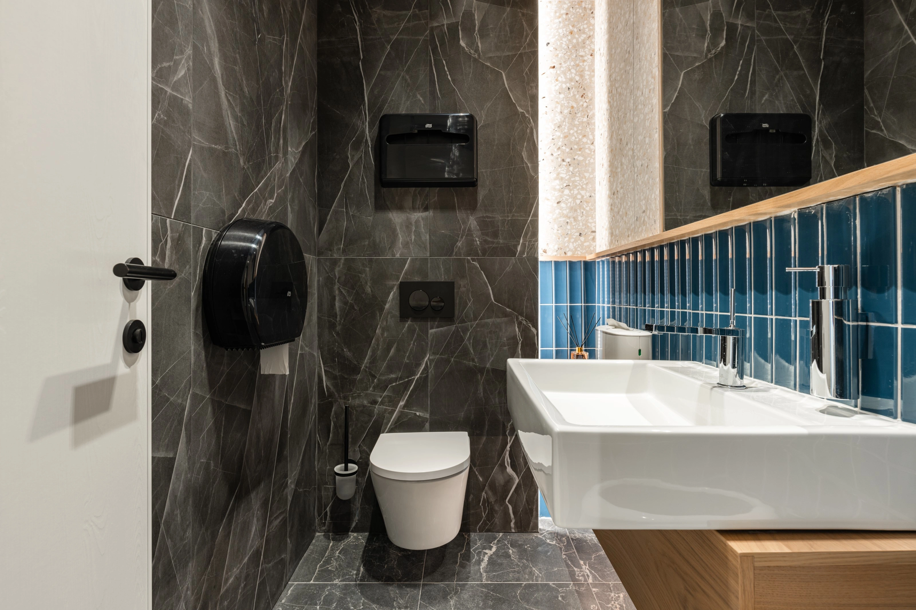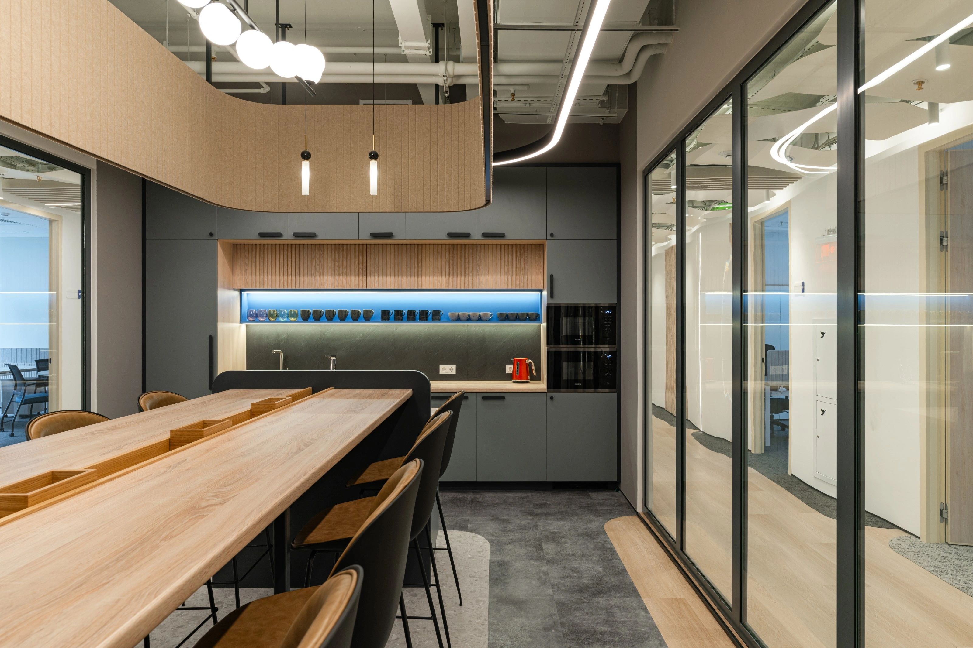 Двери также привносят разнообразие: в переговорные — чёрные, в служебные помещения — белые со скрытой коробкой, а в рабочие кабинеты — выполнены под дерево.