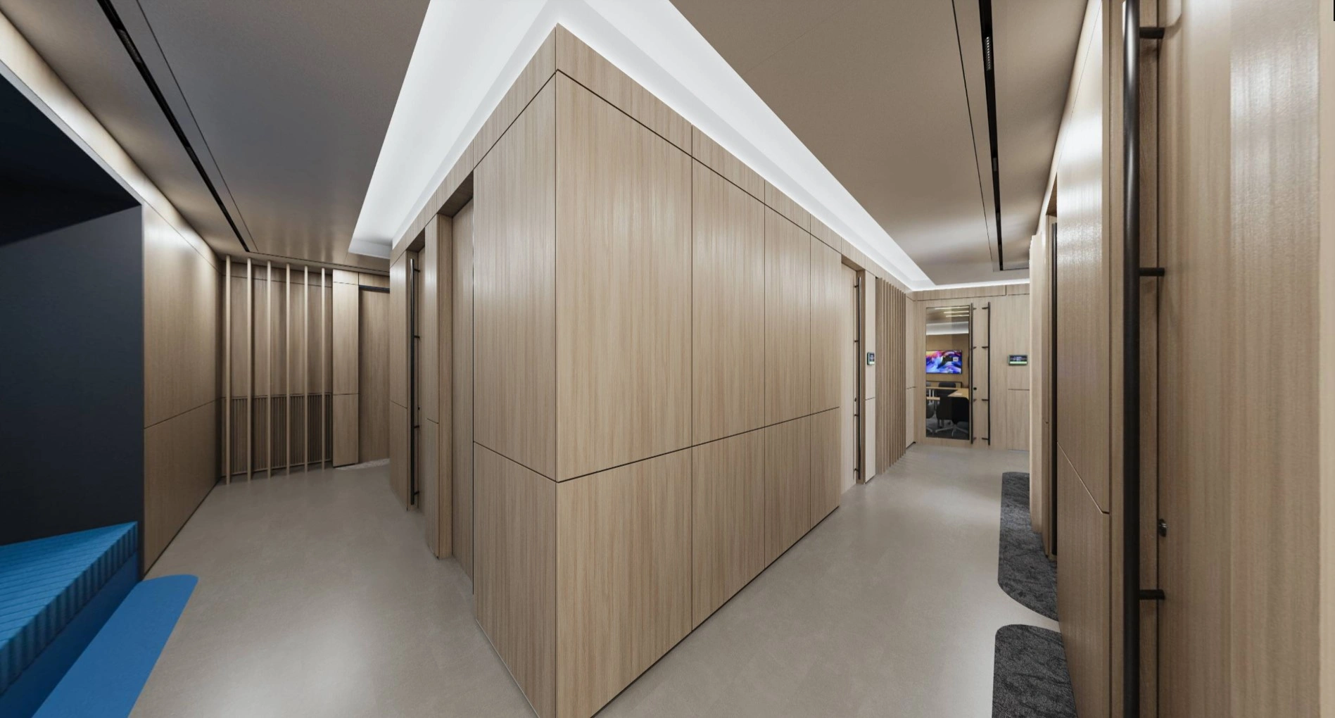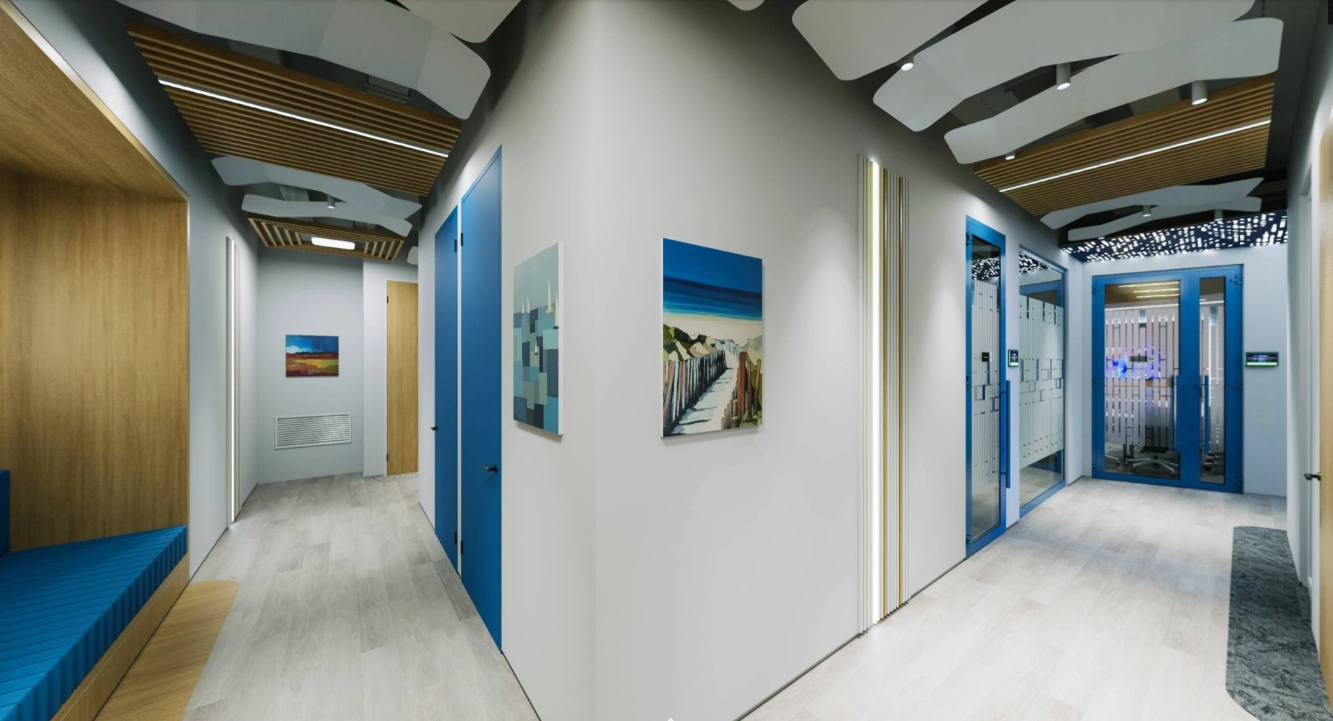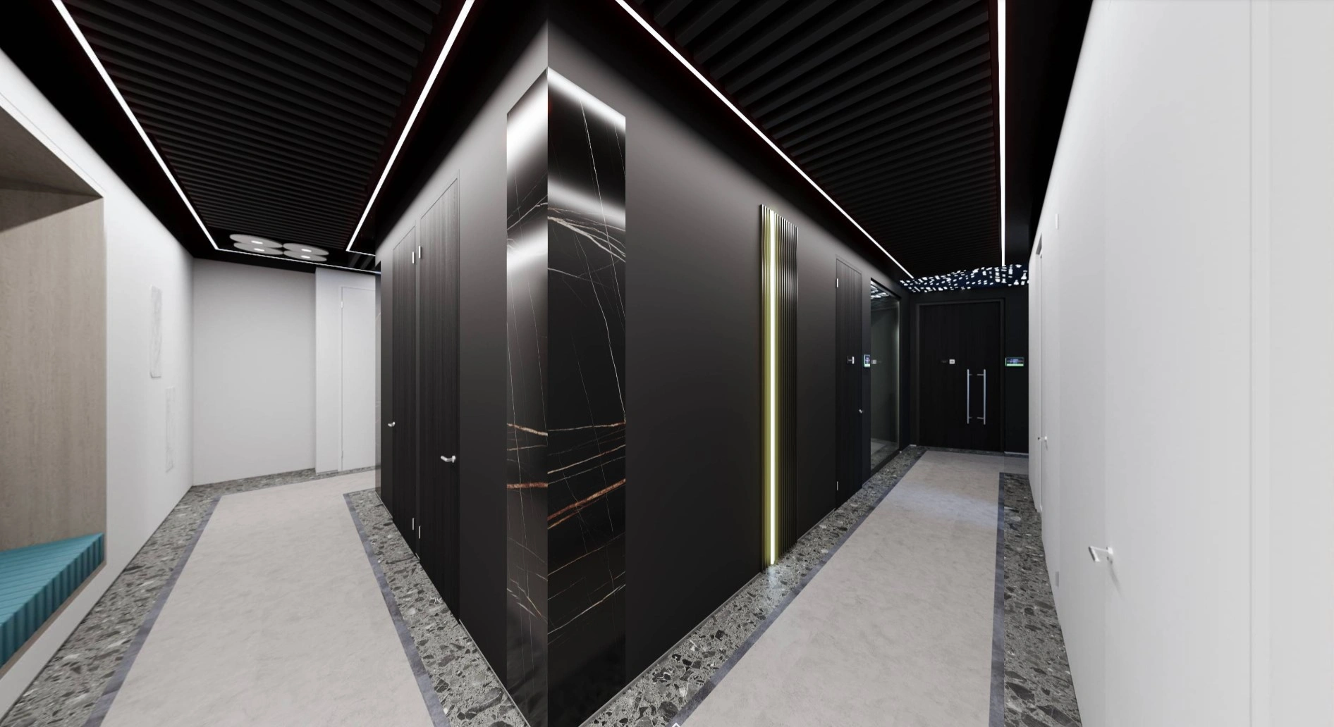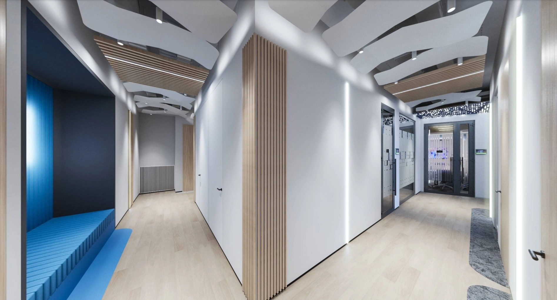 Помимо нестандартного потолка, мы разместили на стенах реечные панели и вертикальные светодиодные ленты, чтобы дополнительно разбавить монотонность, сделать коридор светлее и улучшить ориентацию в нём. На углах тоже реечные панели — защищают их от повреждений.