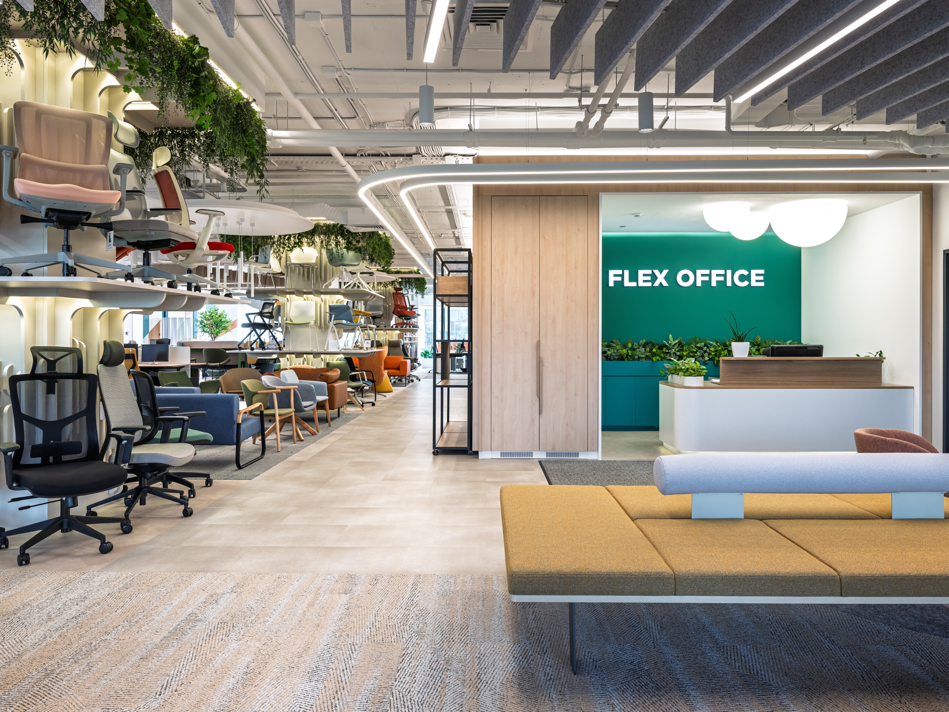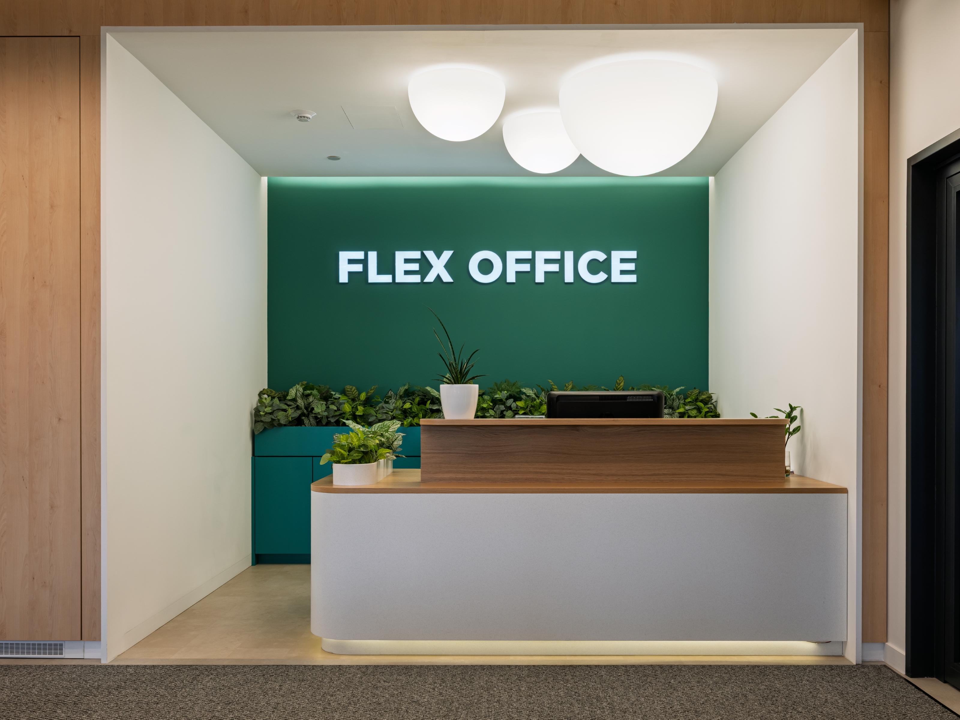 Рецепция работает как первая демонстрация: компактная стойка, зелёная стена с логотипом FLEX OFFICE и несколько вариантов мебели для зон ожидания. Уже здесь считывается подход: офис выставляет на обозрение реальный набор решений, которые работают на компании каждый день.