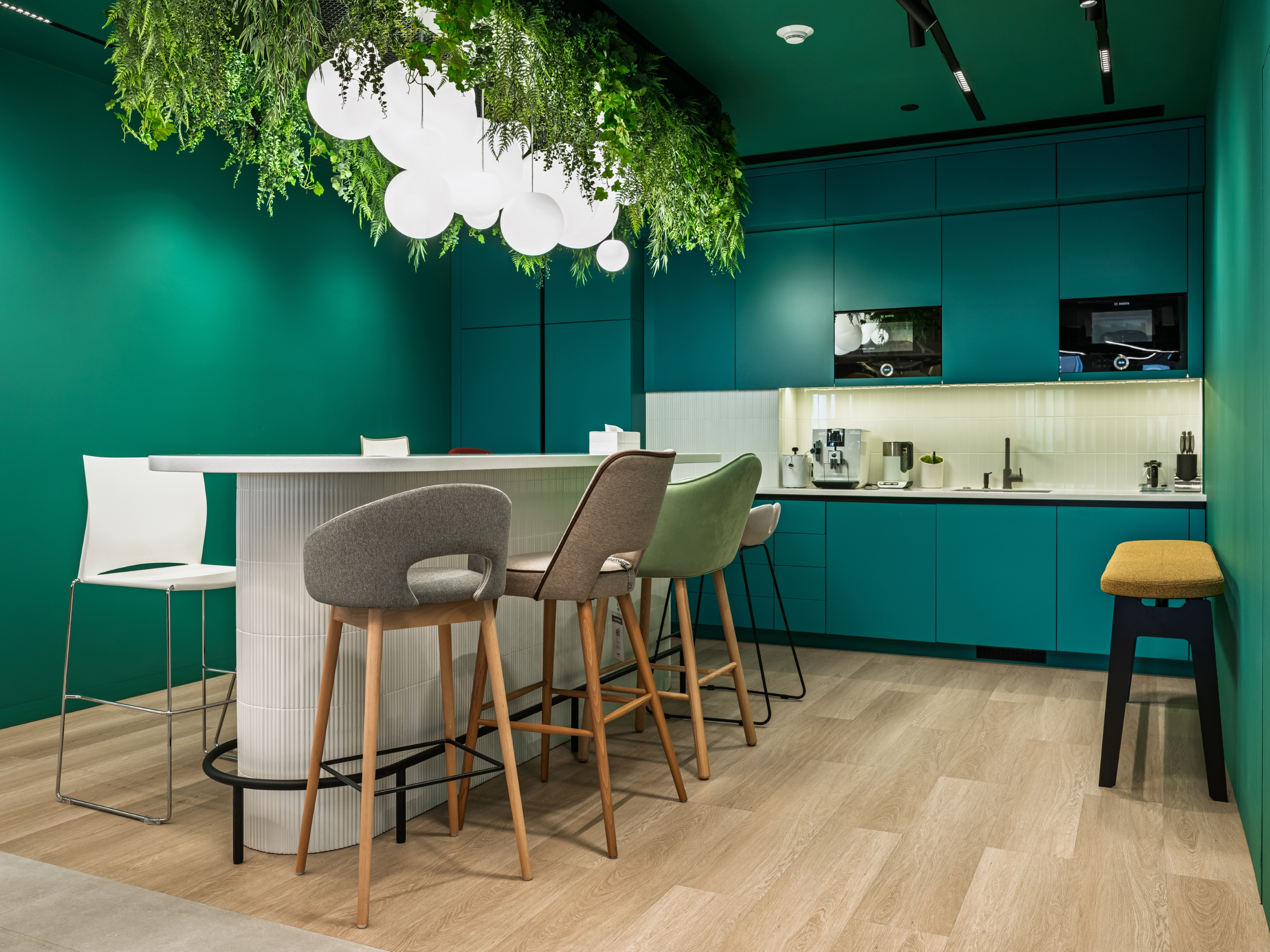 Открытый кафетерий расположен в геометрическом центре офиса и фактически играет роль городской площади. Высокий барный стол, разные модели барных стульев, плотный объём кухни с встраиваемой техникой и подвес с растительностью и светильниками создают зону, к которой постоянно возвращаются и сотрудники, и гости.