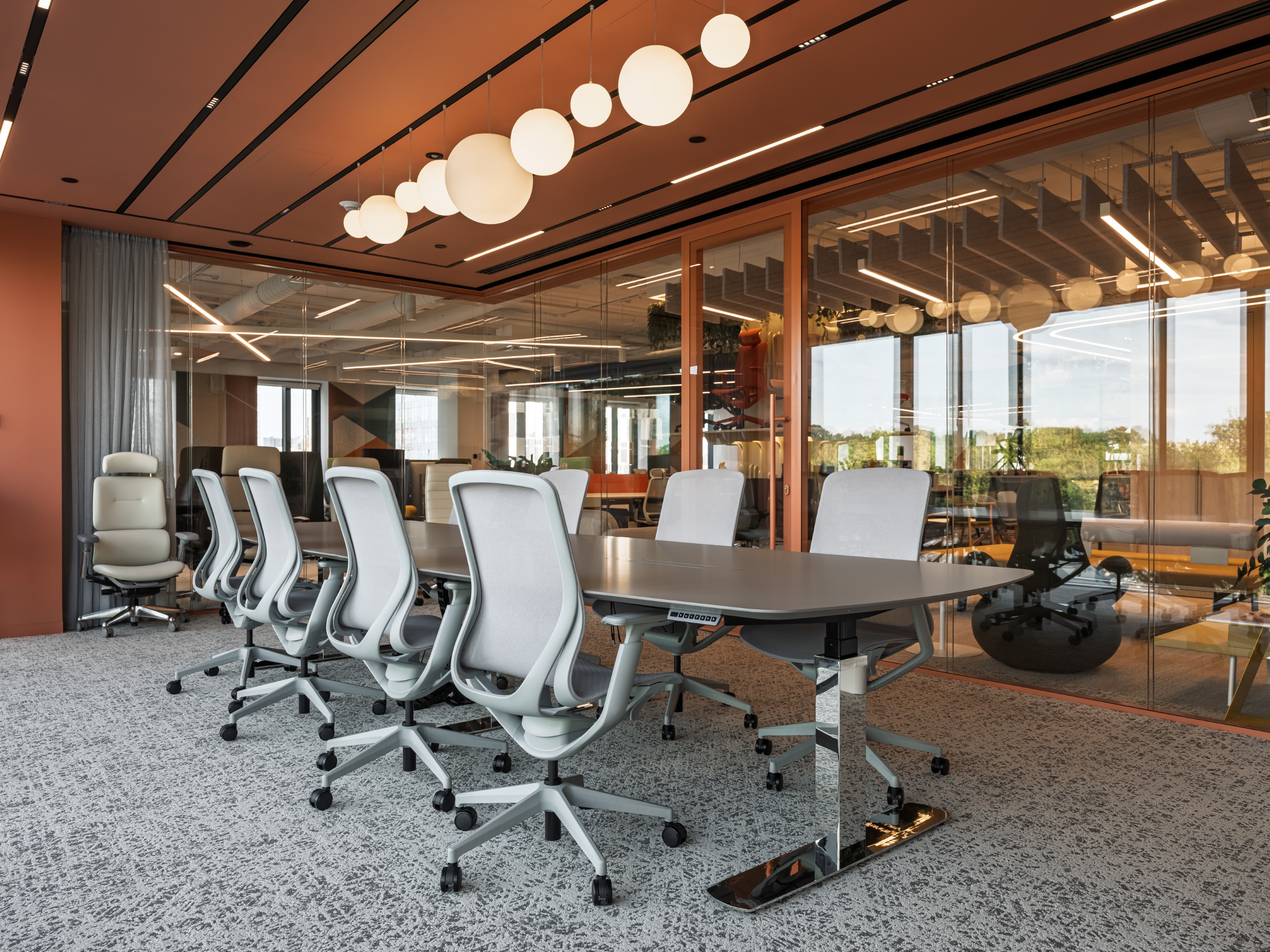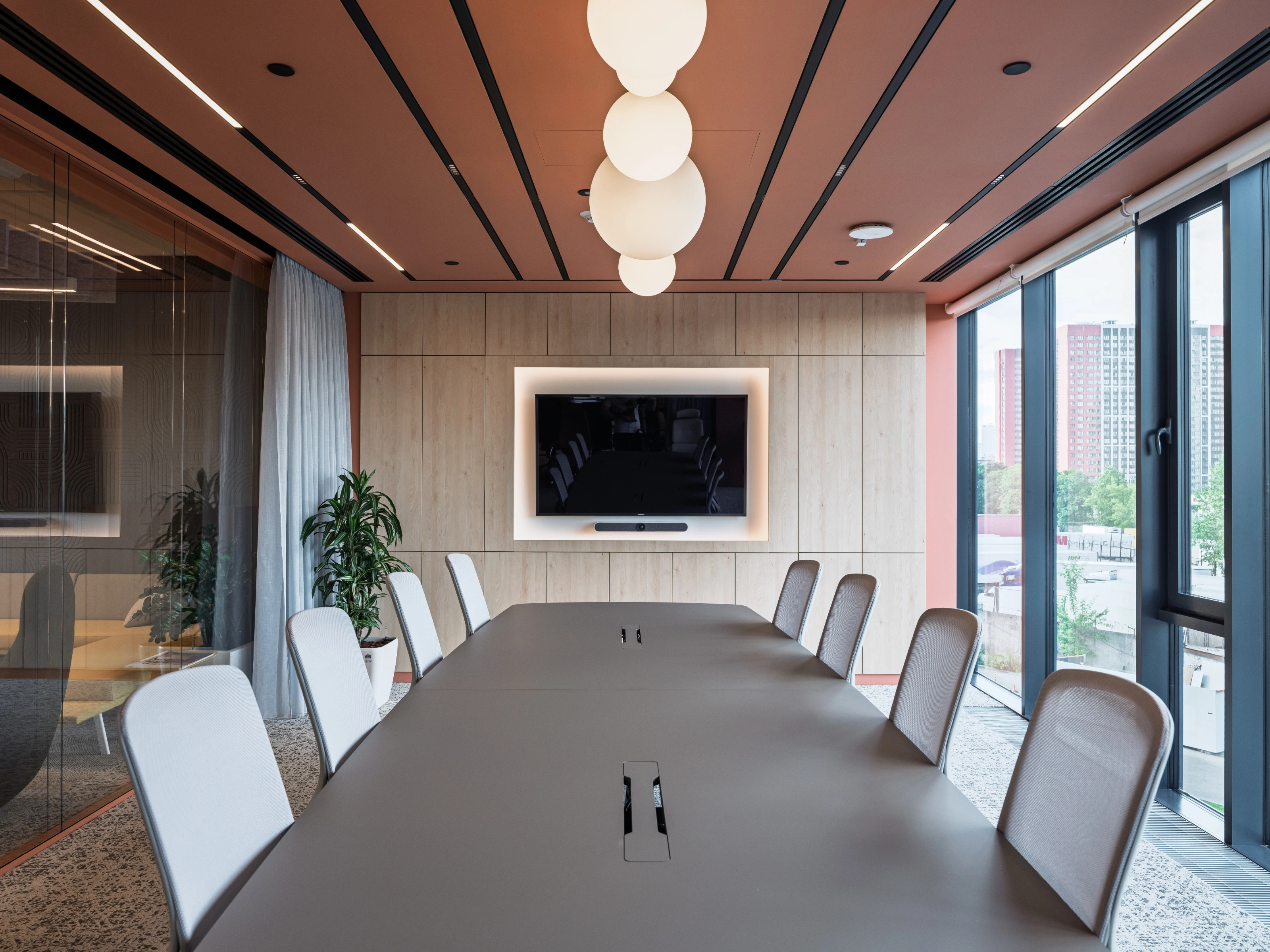 Сразу за входом — три акцента: остеклённая переговорная слева, перспектива центрального зала с открытым кафетерием и вертикальные стеллажи для кресел, обрамляющие колонны. Переговорная построена на контрасте: спокойная гамма, ровный свет, практически монохромная обстановка, которую собирают воедино потолочные линии и шарообразные светильники. Это не «парадная» комната, а рабочий инструмент — её легко представить с разложенными чертежами или открытыми таблицами.