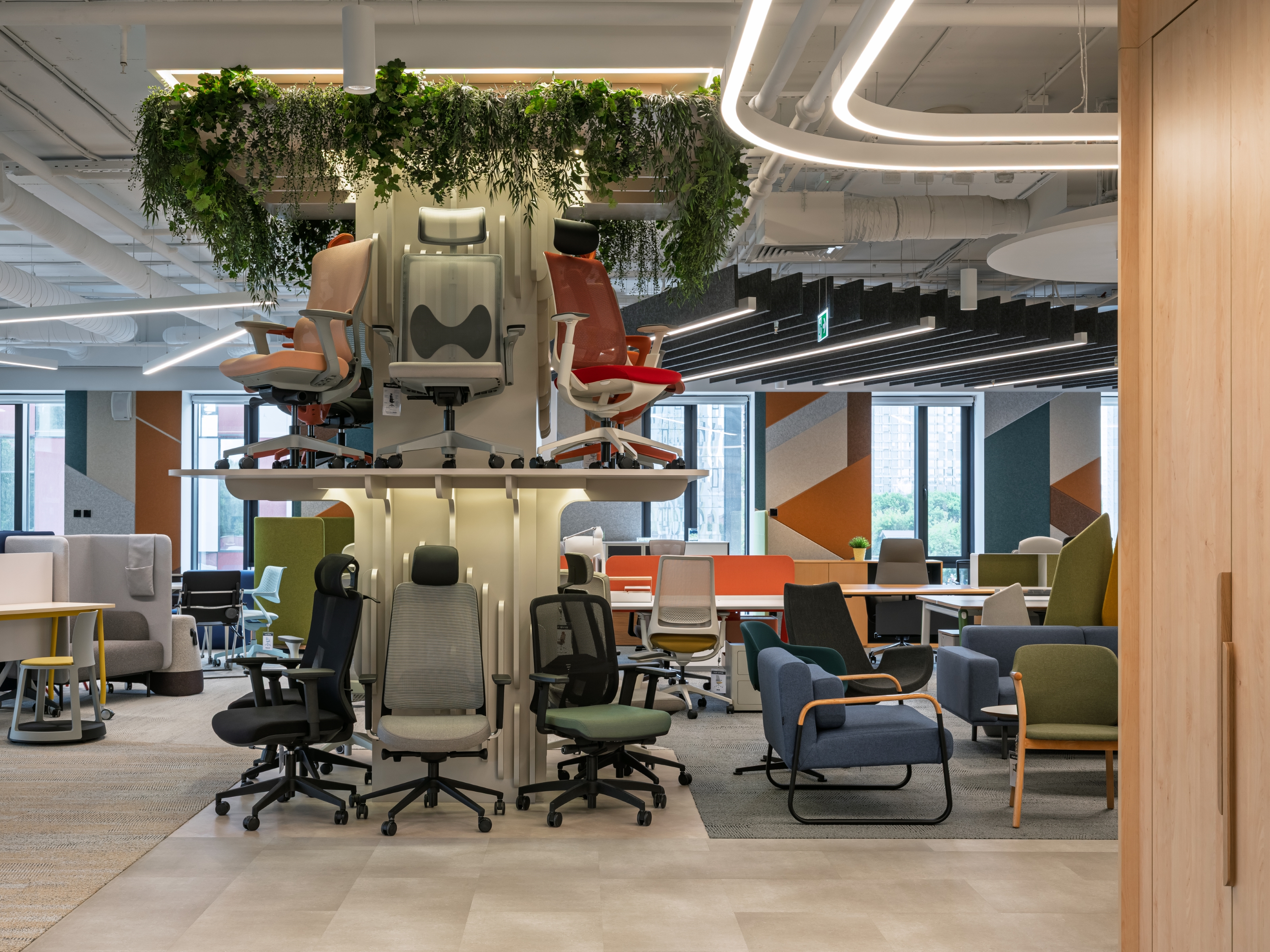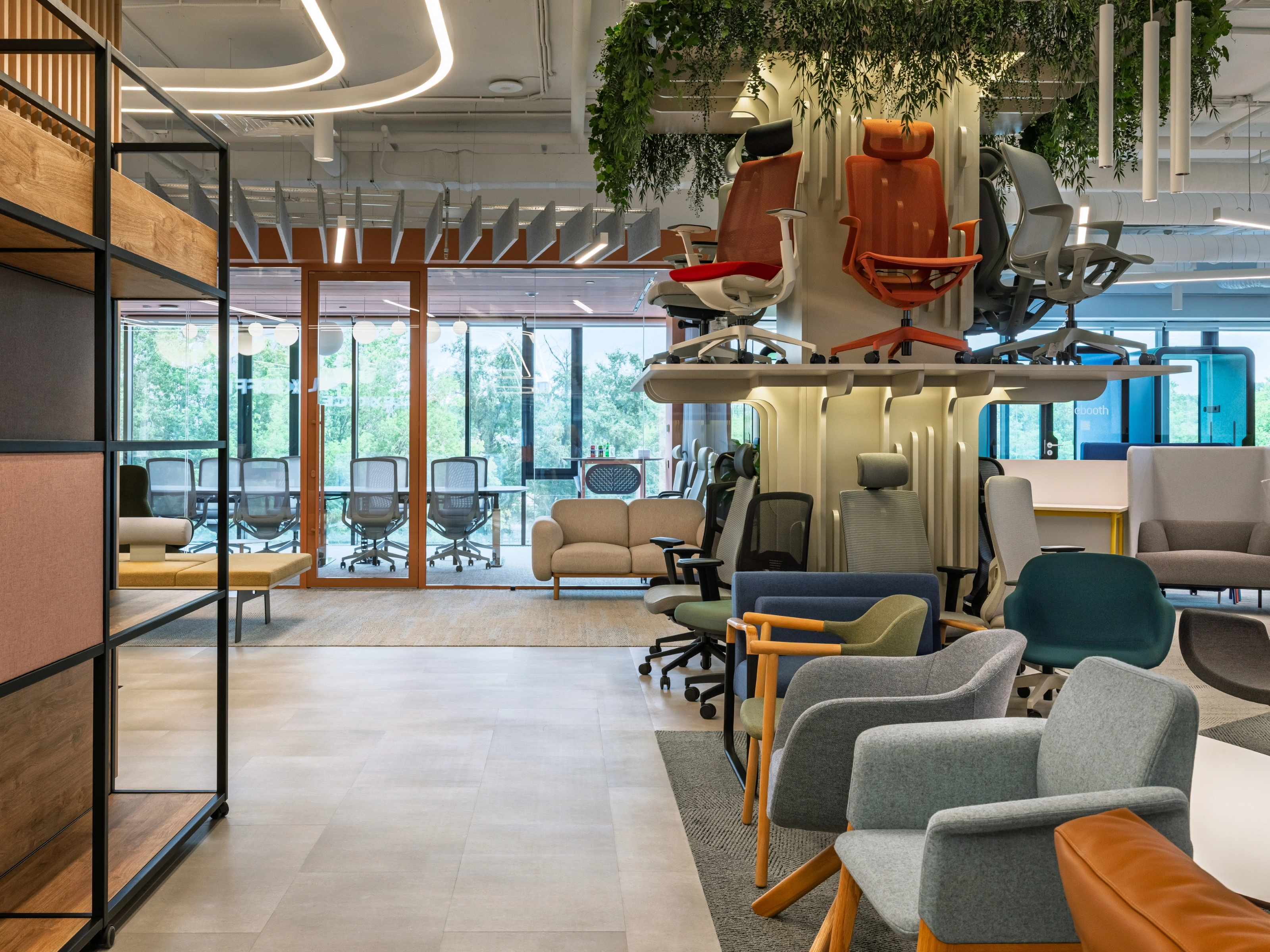 Многоярусные полки вокруг колонн — самый узнаваемый элемент проекта и его визуальный центр. Вместо привычной «батареи» с образцами кресла подняты по вертикали: снизу — модели, которые хочется сразу протестировать, выше — более редкие конфигурации и вариации отделок, подсвеченные так, чтобы читались силуэты, а не только ткани.