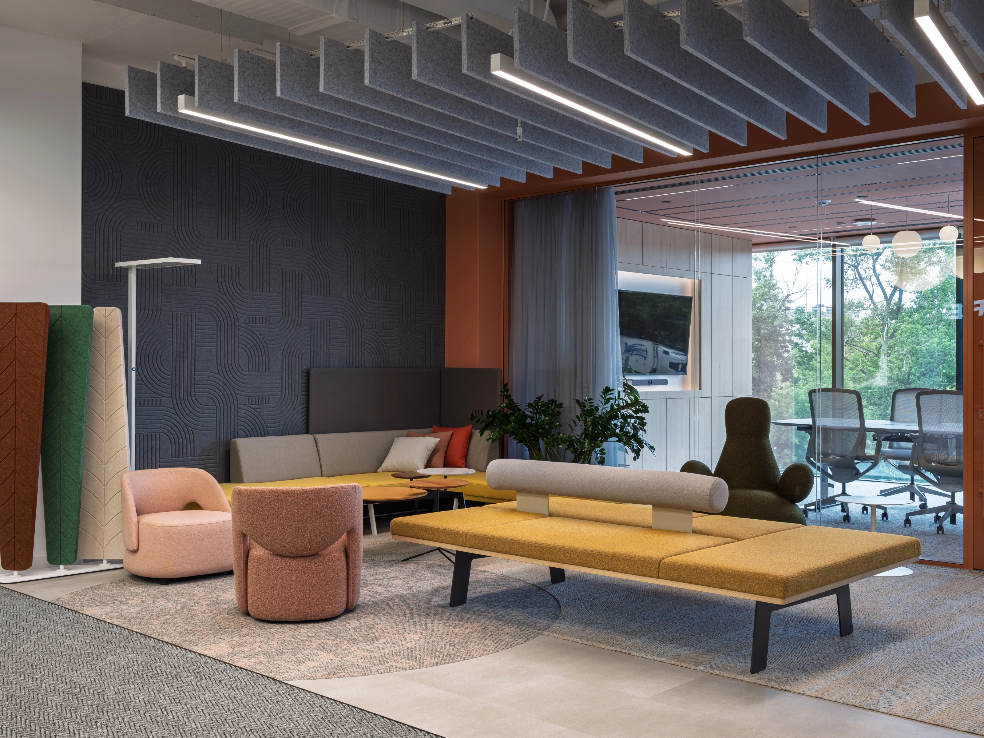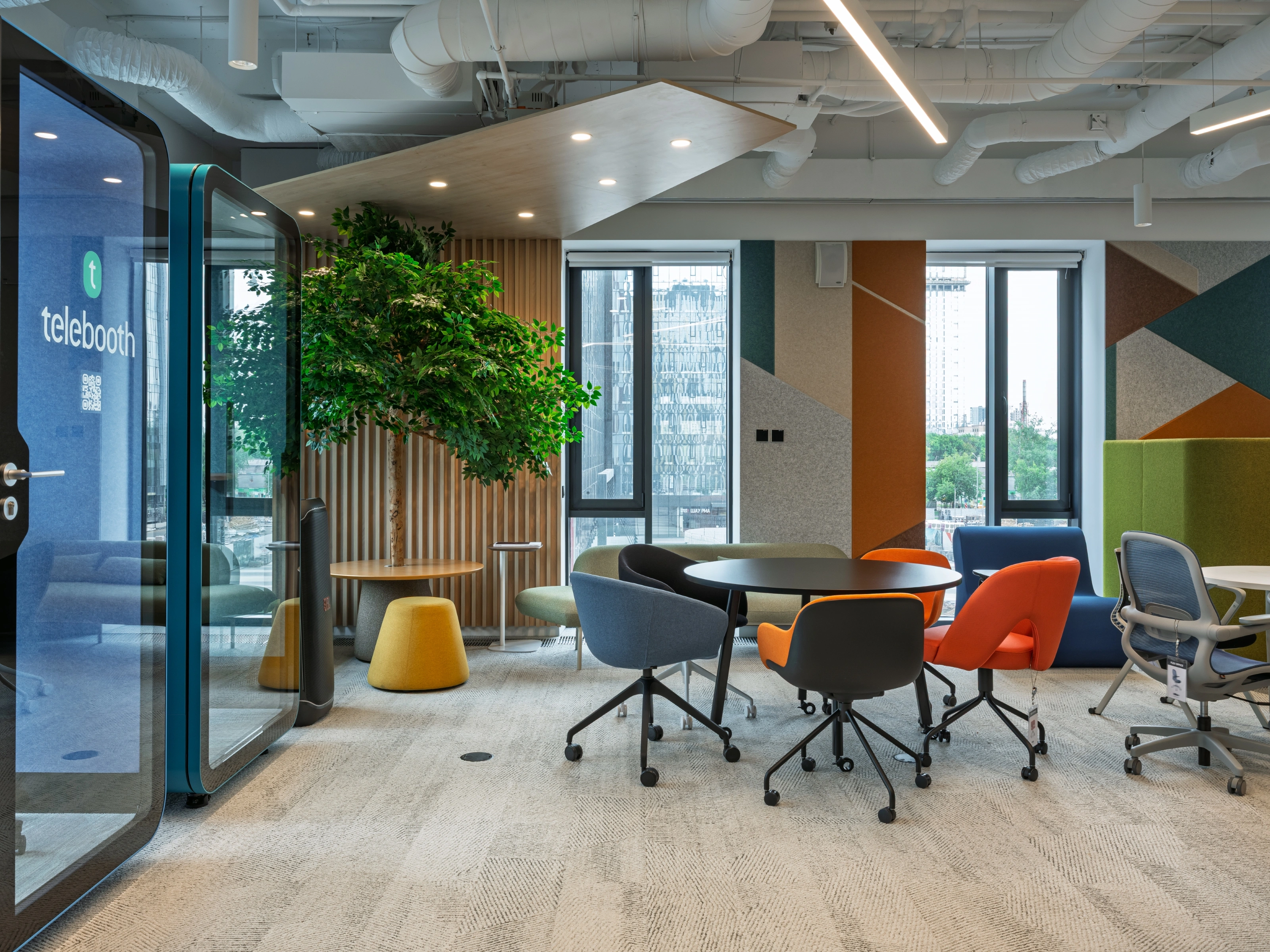 Материалы подобраны без намеренной демонстративности: ковровая плитка Voxflor с мягким геометрическим рисунком различается по зонам, но не бросается в глаза, оставляя первую роль мебели. Акустические панели FlyFelt на потолке и стенах встраиваются в архитектуру, а не декорируют её, при этом ощутимо глушат шумовой фон — особенно в центральной части офиса.