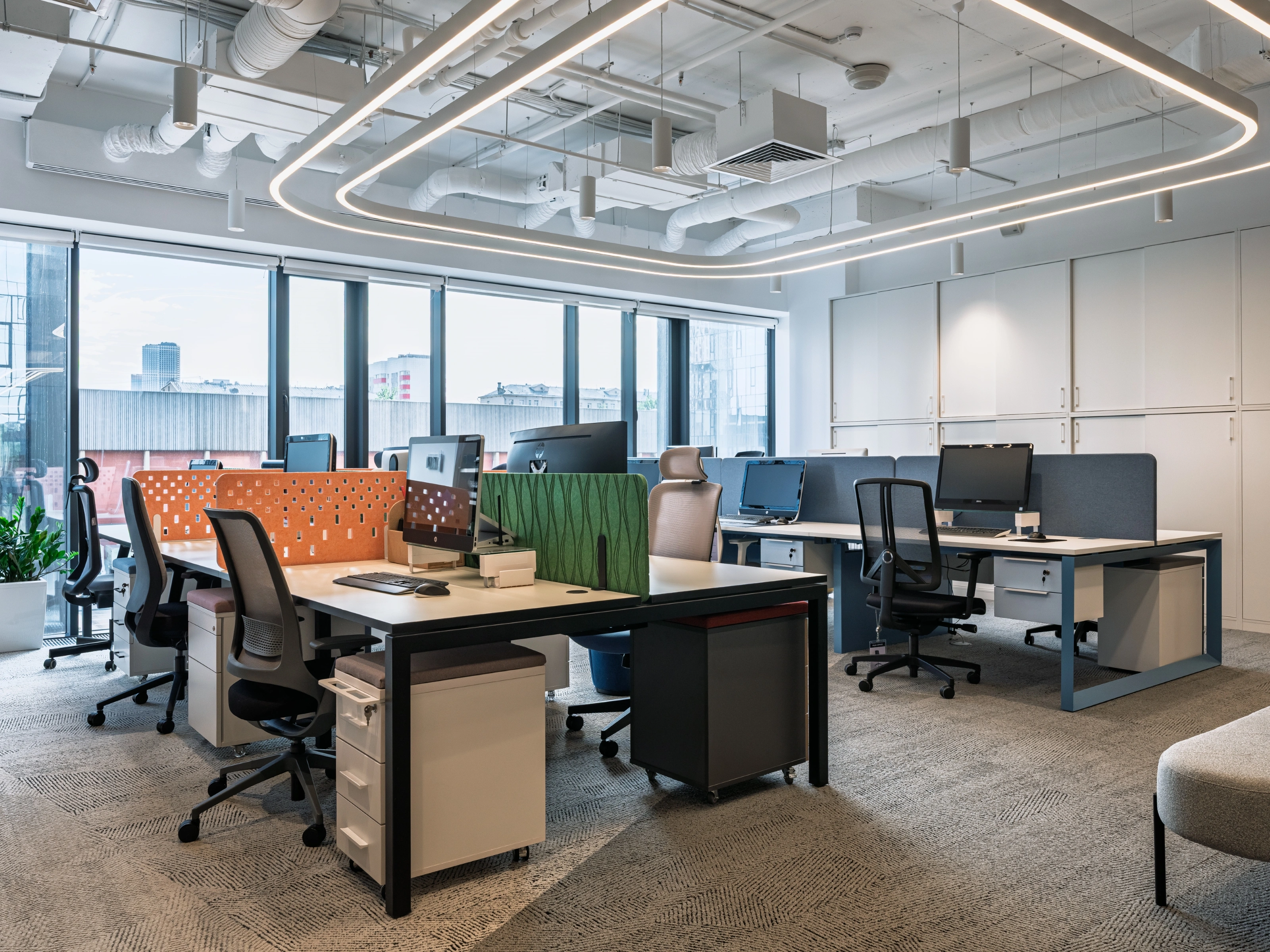 Дальше маршрут дробится на более мелкие эпизоды. Неформальные зоны с мягкими посадками и кабины тишины дают представление о том, как в одном офисе уживаются разные форматы общения — от короткого разговора до изолированного звонка. Центральная зона не превращается в банальный open space: здесь собраны вариации рабочих станций — блоки на два–четыре человека, отдельные руководительские столы, одиночные места, между которыми вплетены лаунж‑группы.