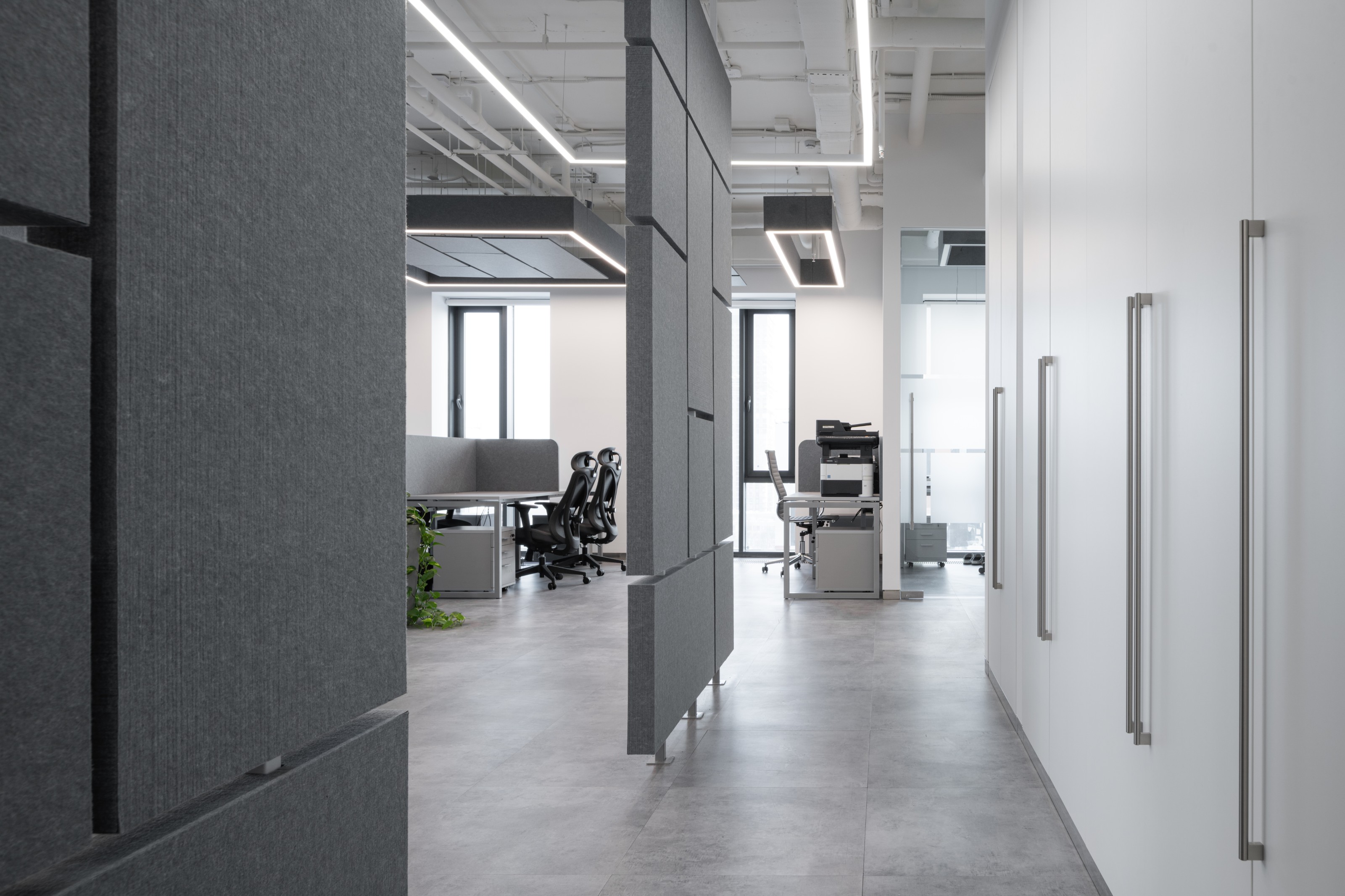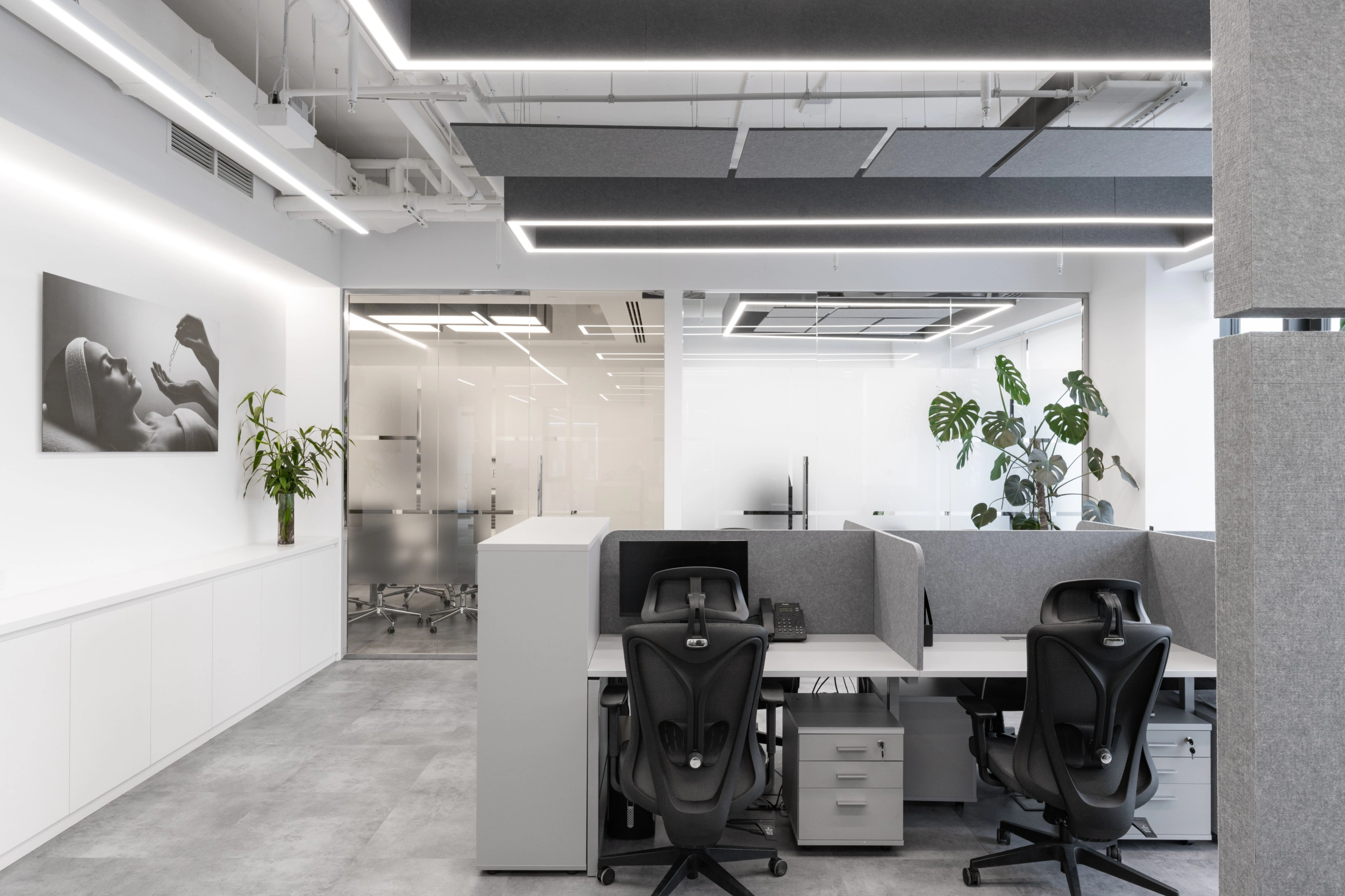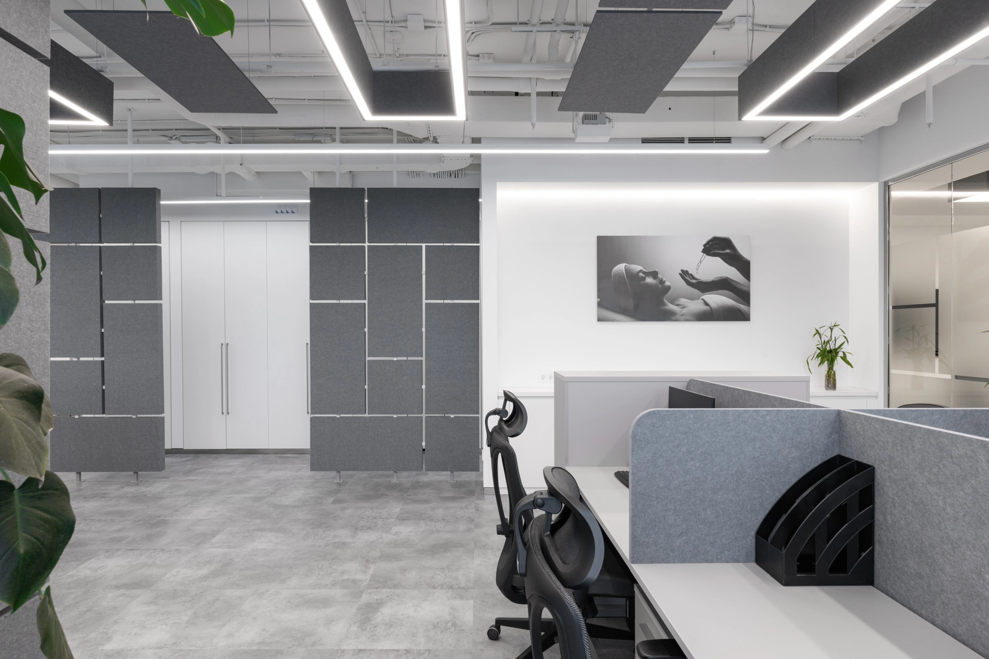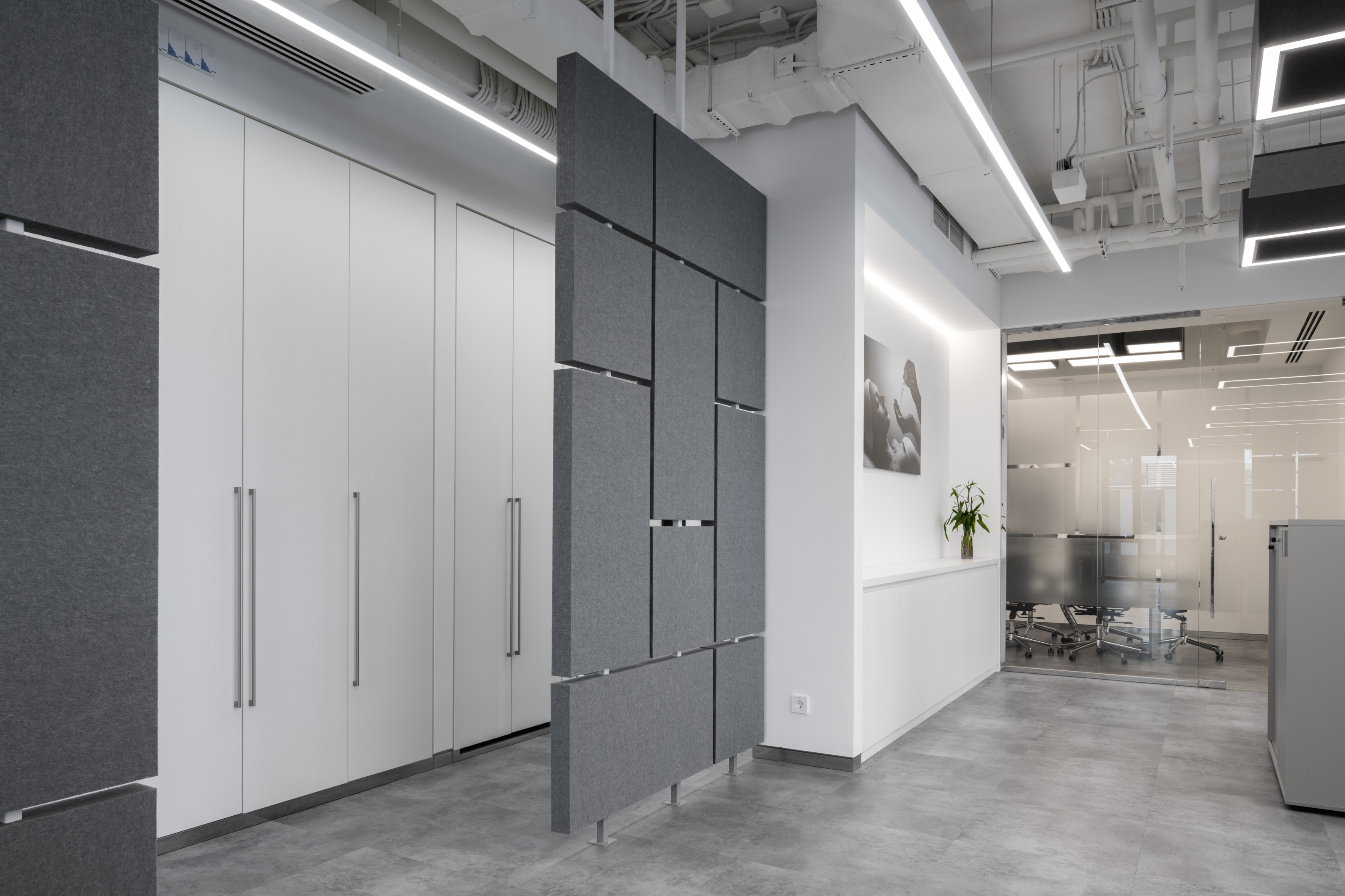 В представительской части мы намеренно усилили ощущение лабораторной чистоты, а в рабочей добавили открытые потолки, акустический фетр и озеленение, чтобы ежедневная работа оставалась комфортной и не превращалась в жизнь в стерильной капсуле.