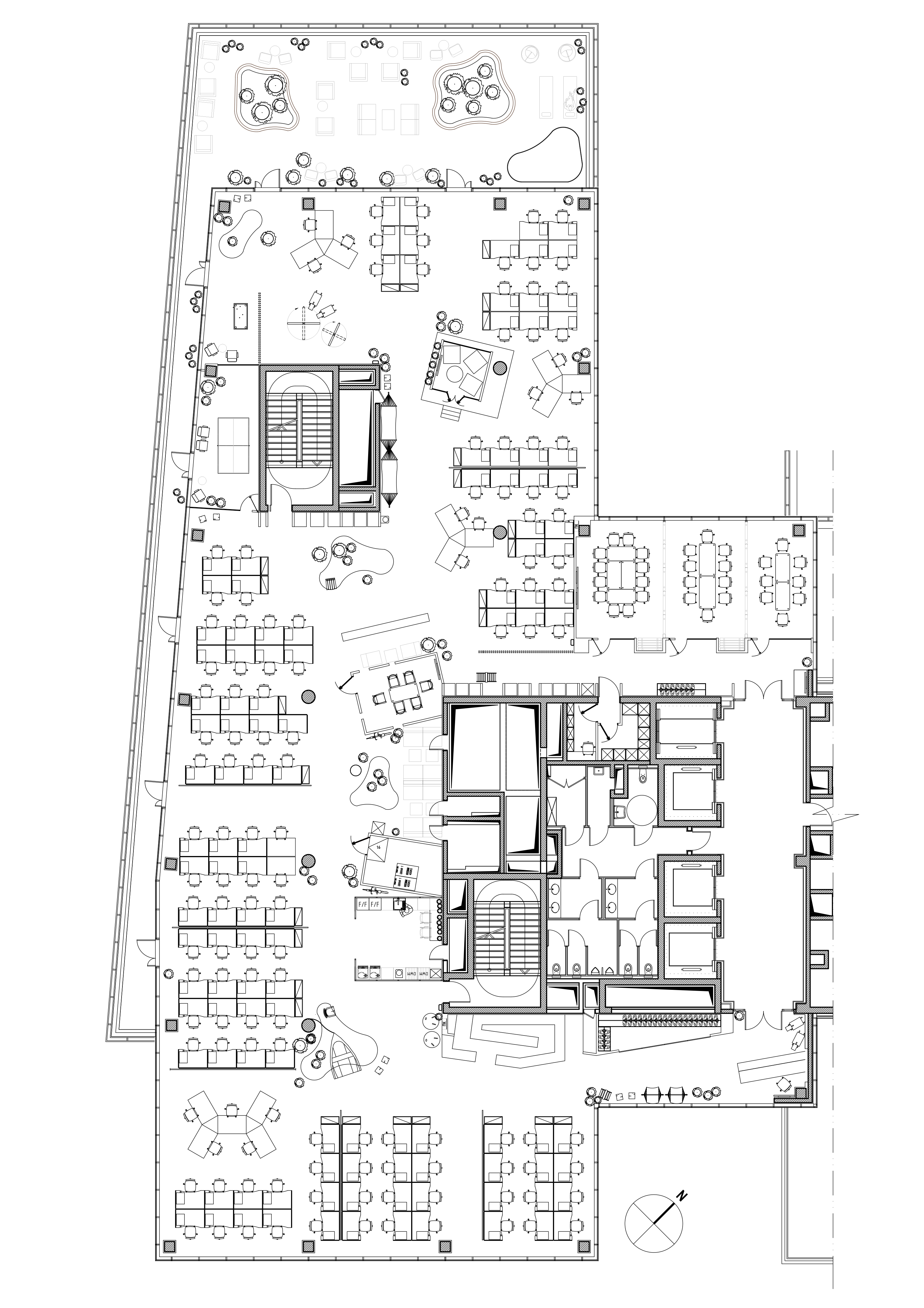 В новом офисе расположился коллектив специалистов, у которого нет жесткой иерархической системы, что было выражено в задании на разработку концепции офисного пространства. Заказчиком была поставлена задача создать уникальный, но комфортный офис с открытой планировкой и близостью к природе.