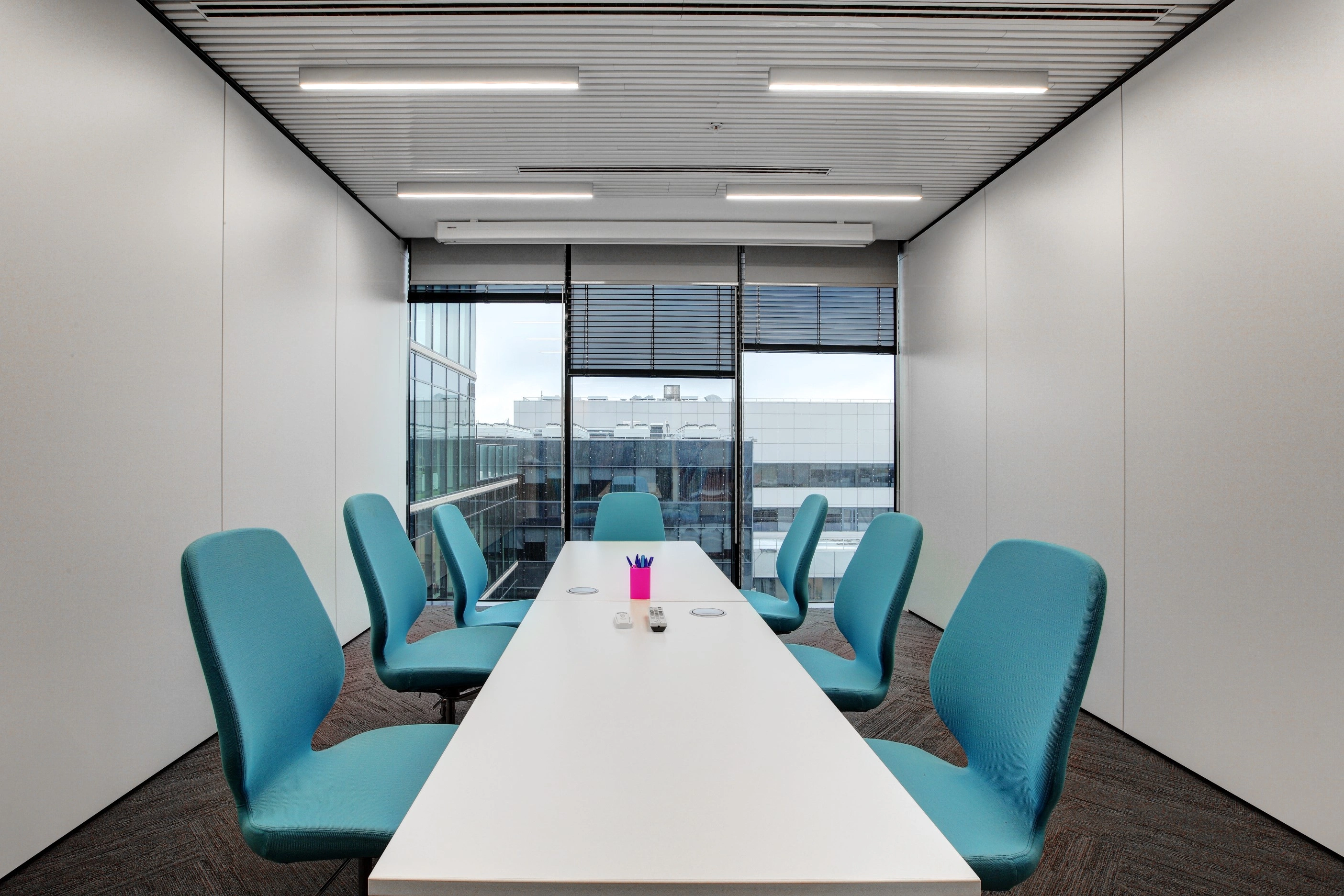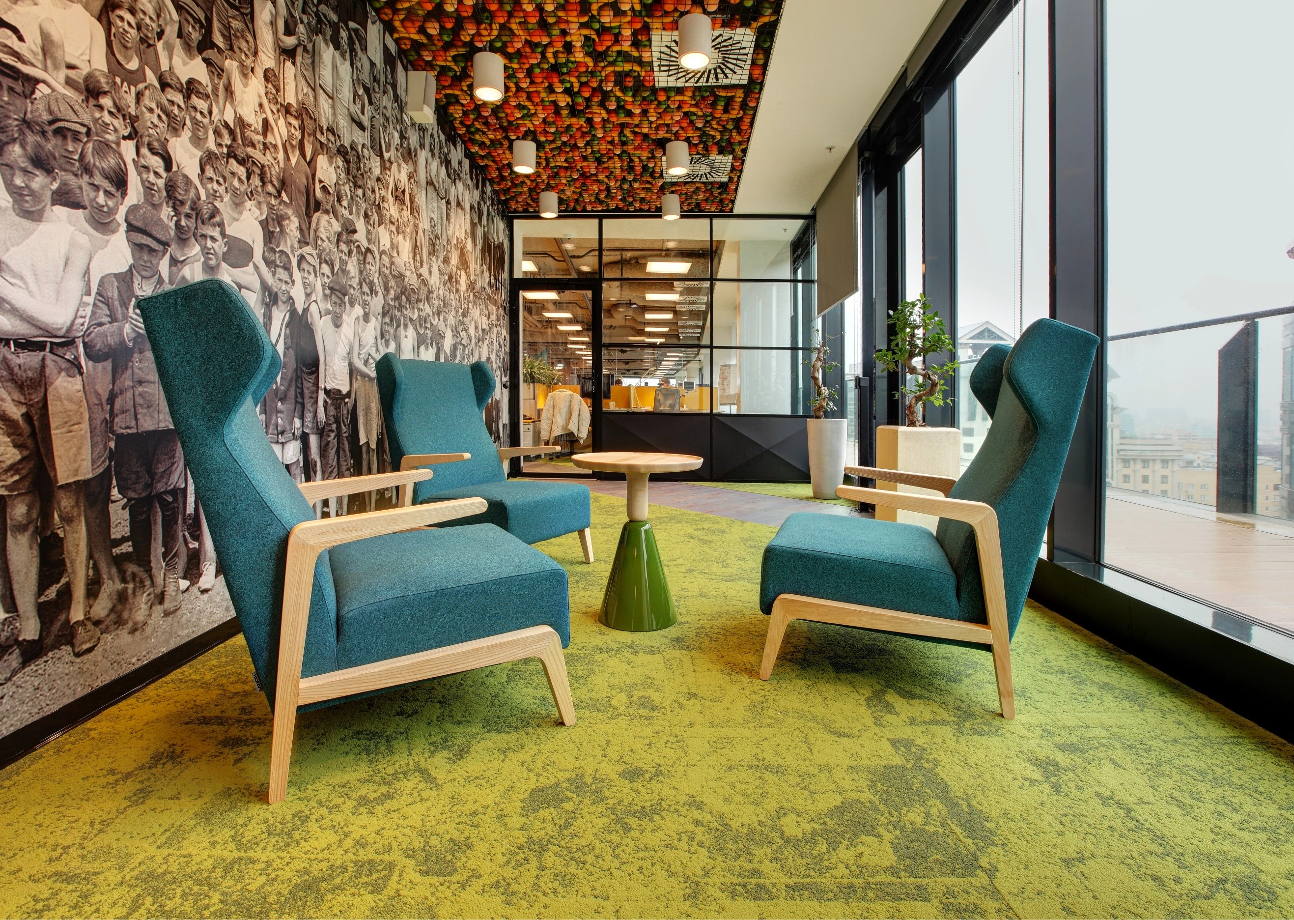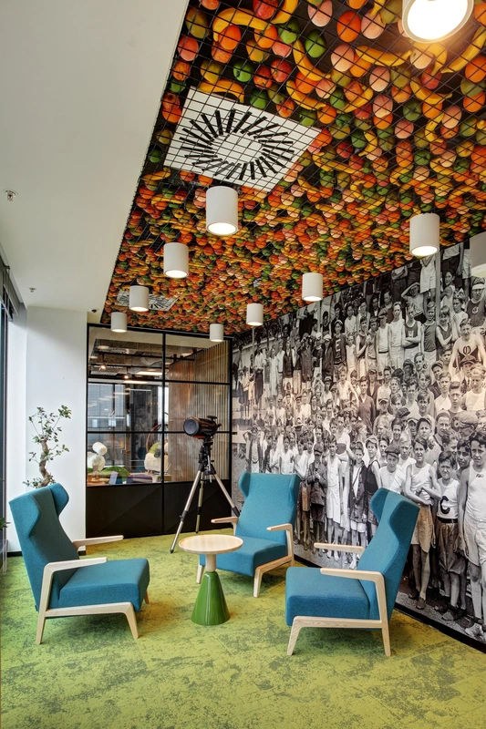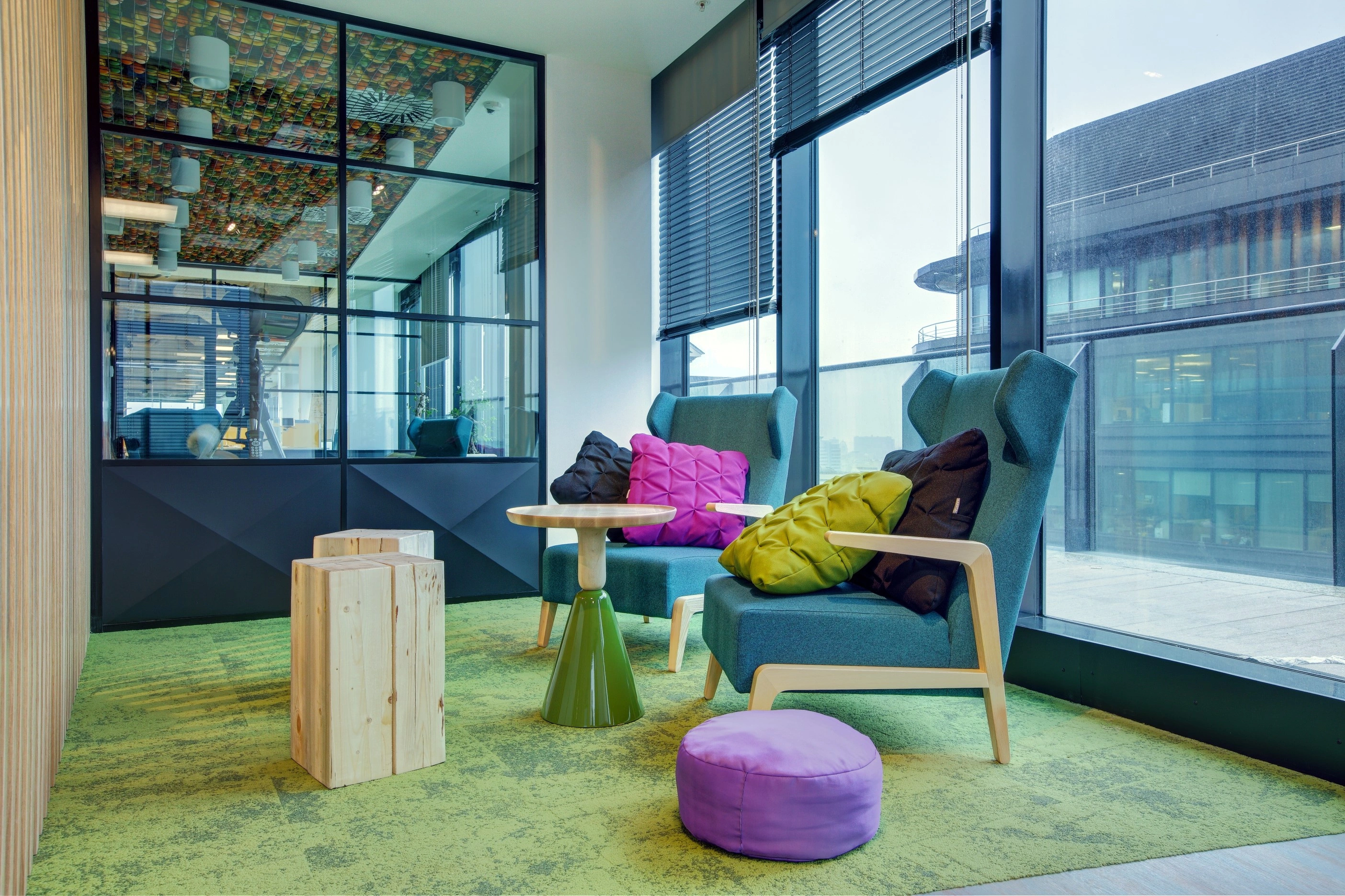 Одной из важнейших задач было создать комфортные акустические условия на рабочих местах для всех сотрудников. Поскольку весь офис не имеет подвесного потолка, коммуникации и перекрытия были покрыты специальным материалом