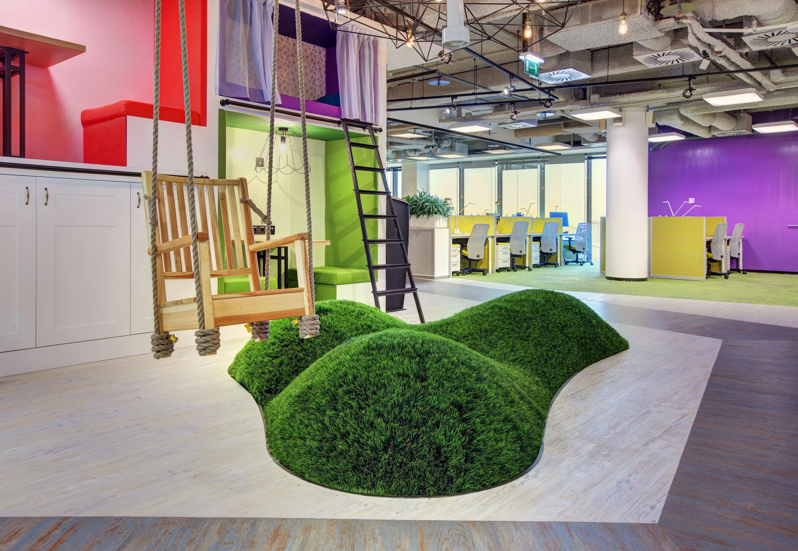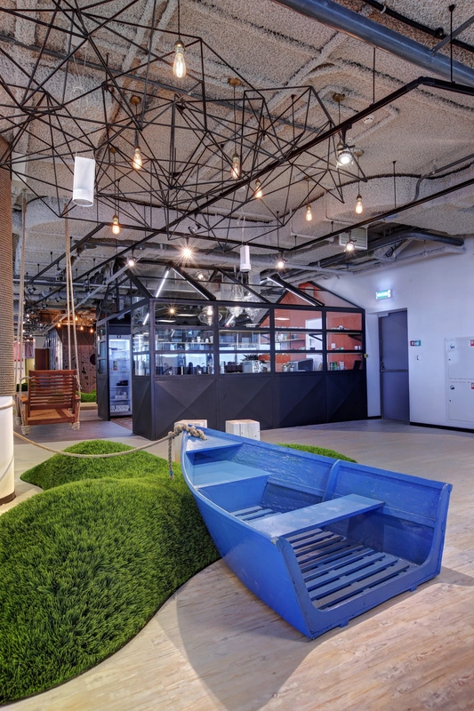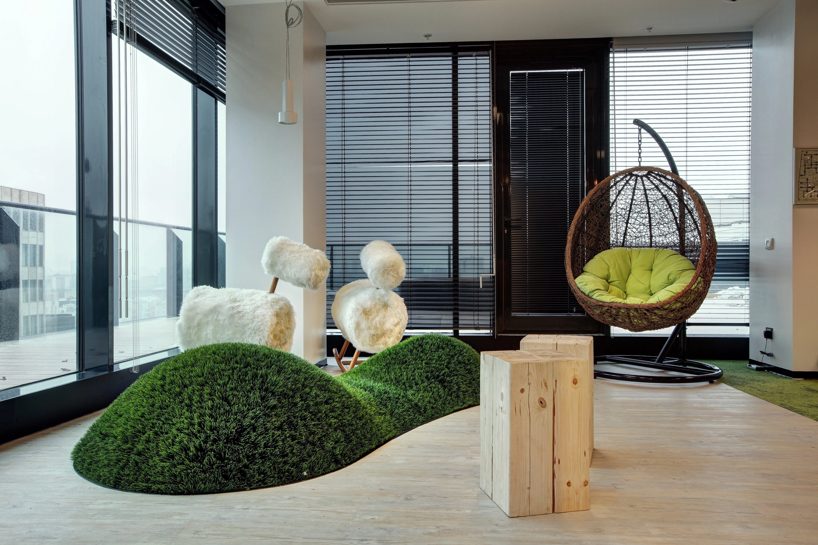 При входе расположена зона рецепции, которая выполнена в виде деревянных ящиков. Сама стойка трансформируемую конструкцию и при необходимости клиентская столешница превращается в рабочую поверхность. Логотип из сена отражает общую атмосферу офиса, творческую и неформальную. Местами ожидания служат барашки-качалки.
