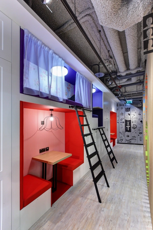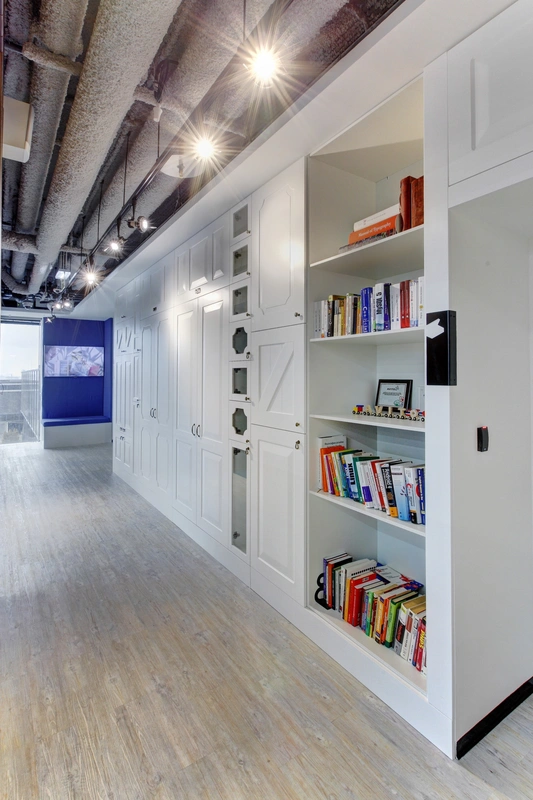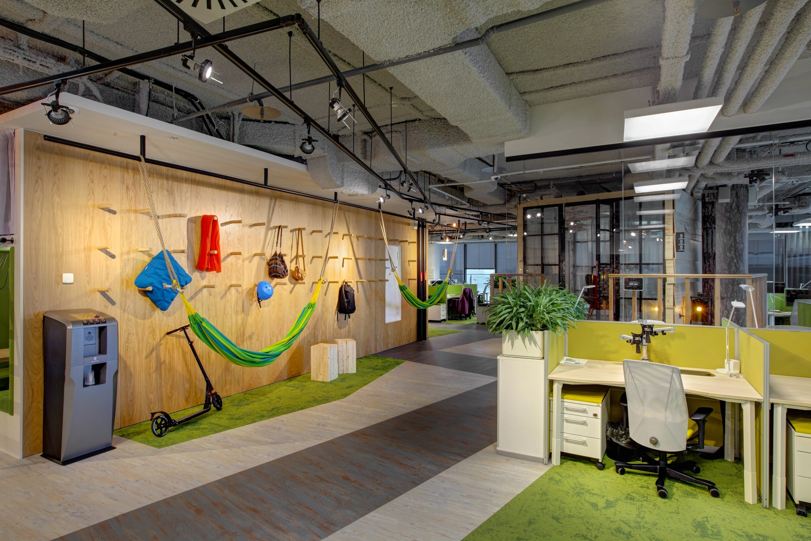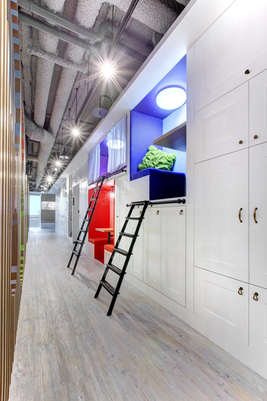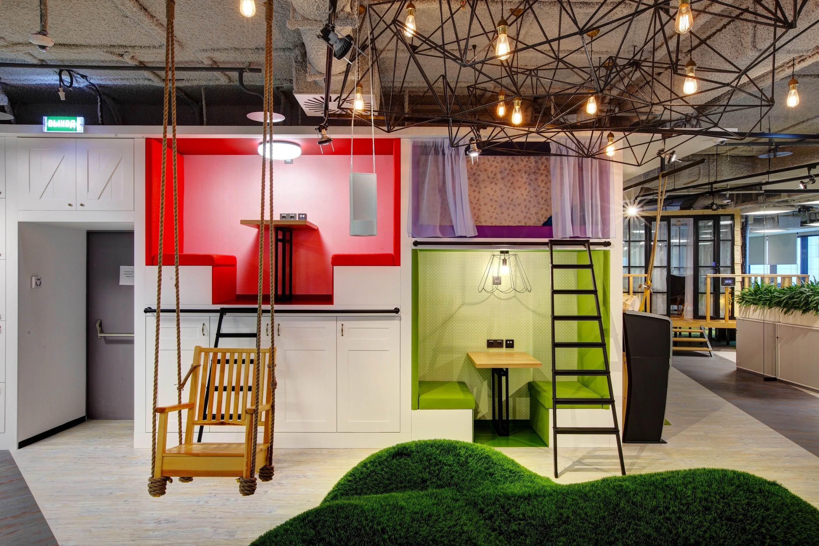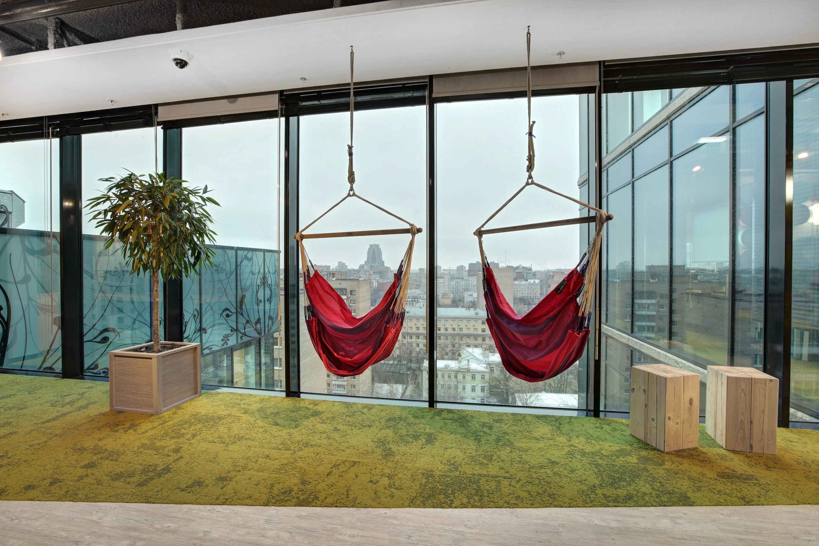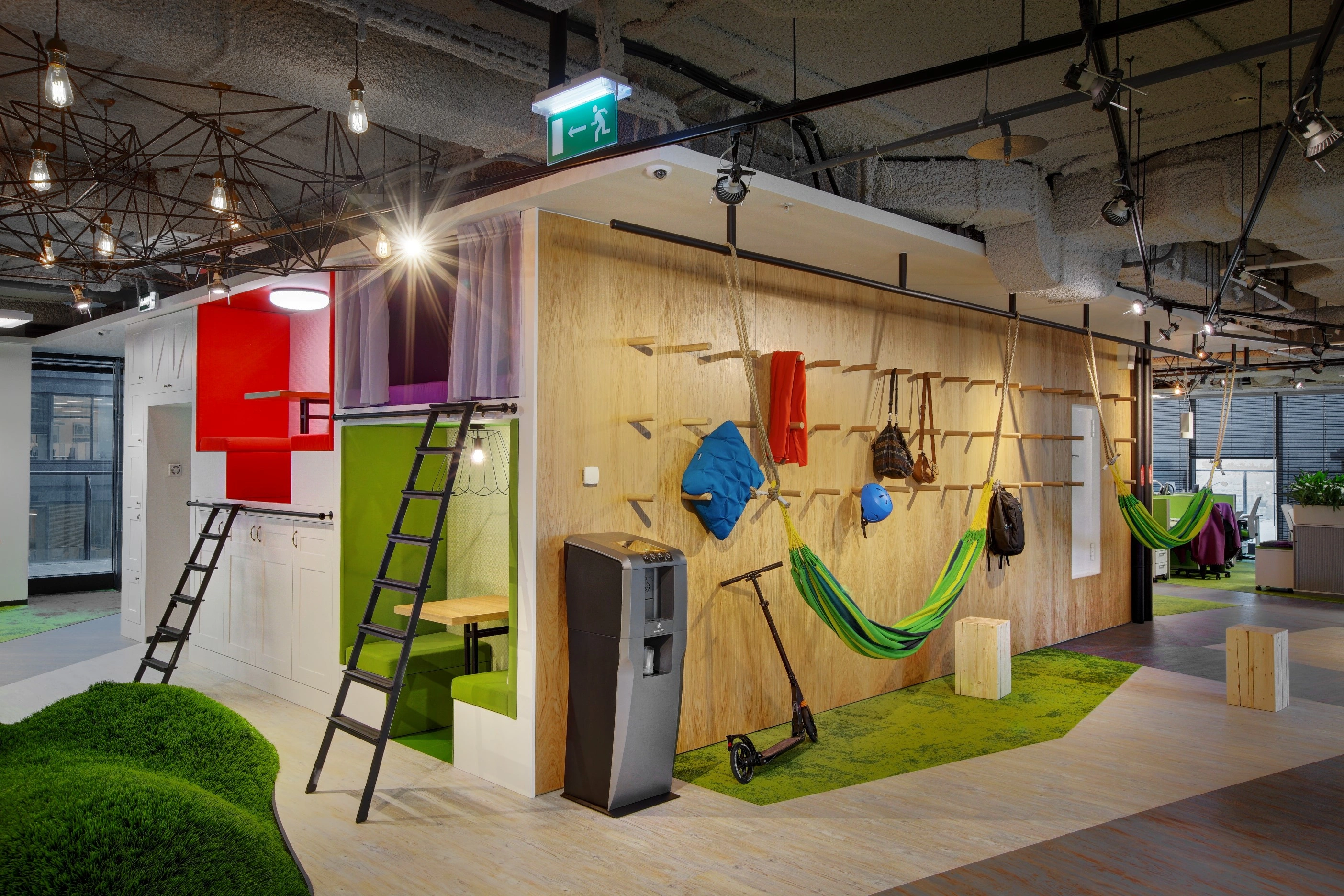 Напротив «дома на дереве» расположена стена с гамаками и колышками для мелких вещей, спортивного инвентаря и настольных игр. Также две стены в офисе заполнены встроенной мебелью для хранения продуктов, книг и различных предметов. В эти стены встроены кабинки с абажурами для переговоров в разных уровнях и кровати для сна и отдыха. Зоны отдыха от рабочих отделяет деревянный забор с выдавленным логотипом Авито.