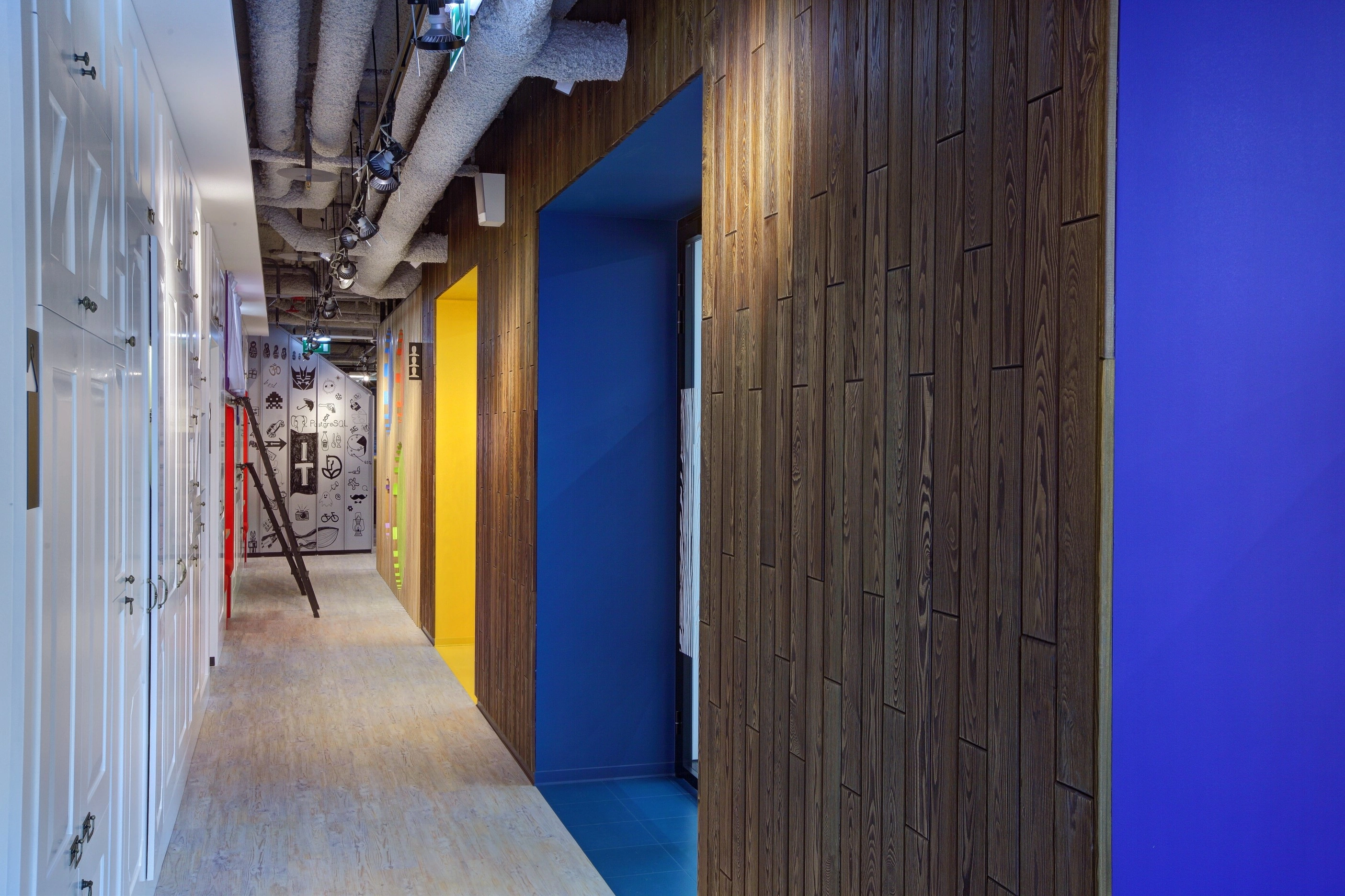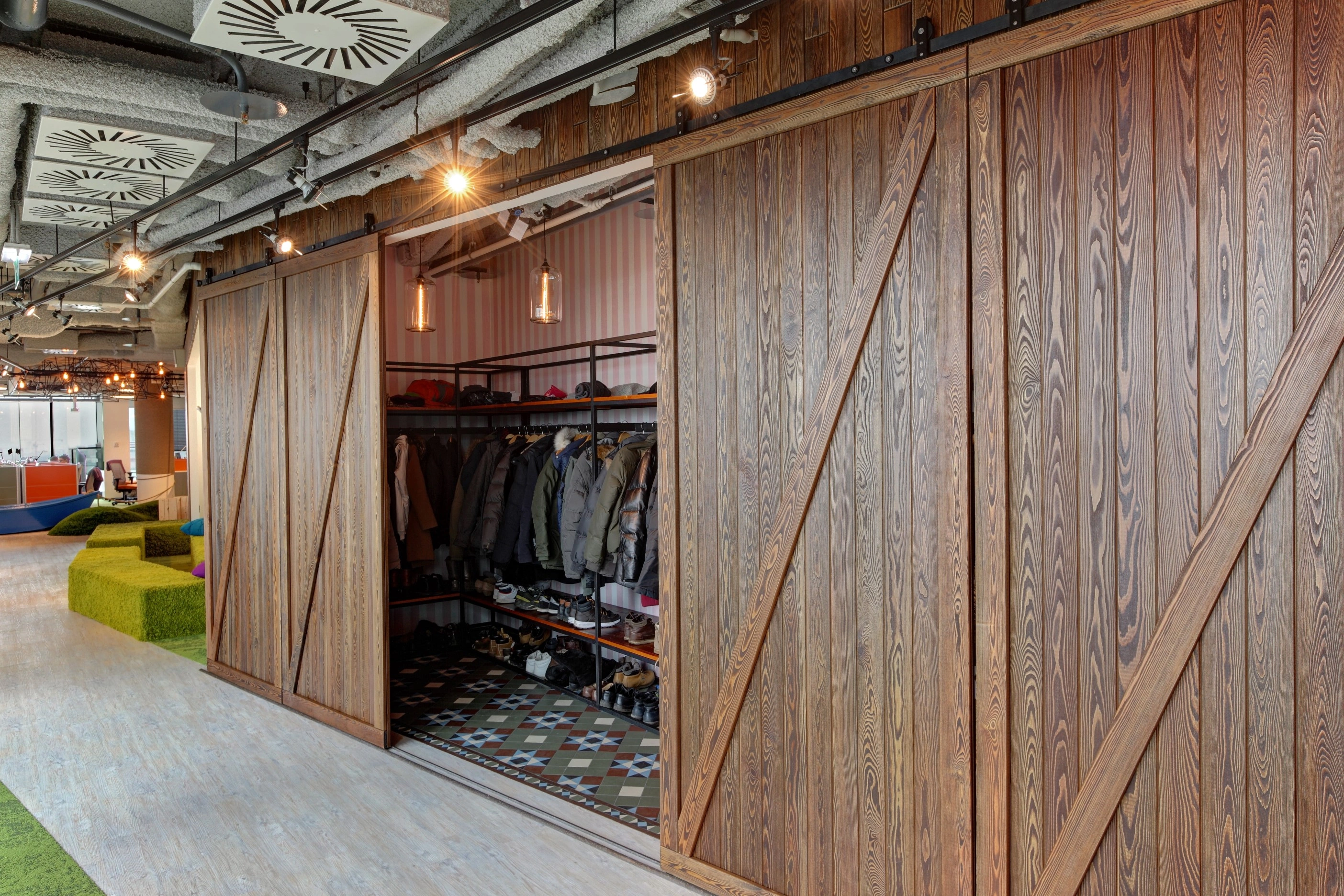 За зоной рецепции расположен гардероб в виде амбара с мозаичными полами и высокими подвесными амбарными дверьми. Сама мебель для одежды выполнена не традиционно встроенной, а открытой и техничной, из металлокаркаса и деревянных полок. К гардеробу примыкает зона неформального общения - сеновал в форме лабиринта. Задняя стена обшита подушками в форме логотипа Авито, а также имеет настенную подсветку.