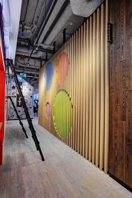 Игровая зона выделена в отдельное помещение для изоляции звука. На стене в игровой - фотообои с толпой заинтересованных зрителей. Потолок усеян фруктами, как в деревенской «сушильне».