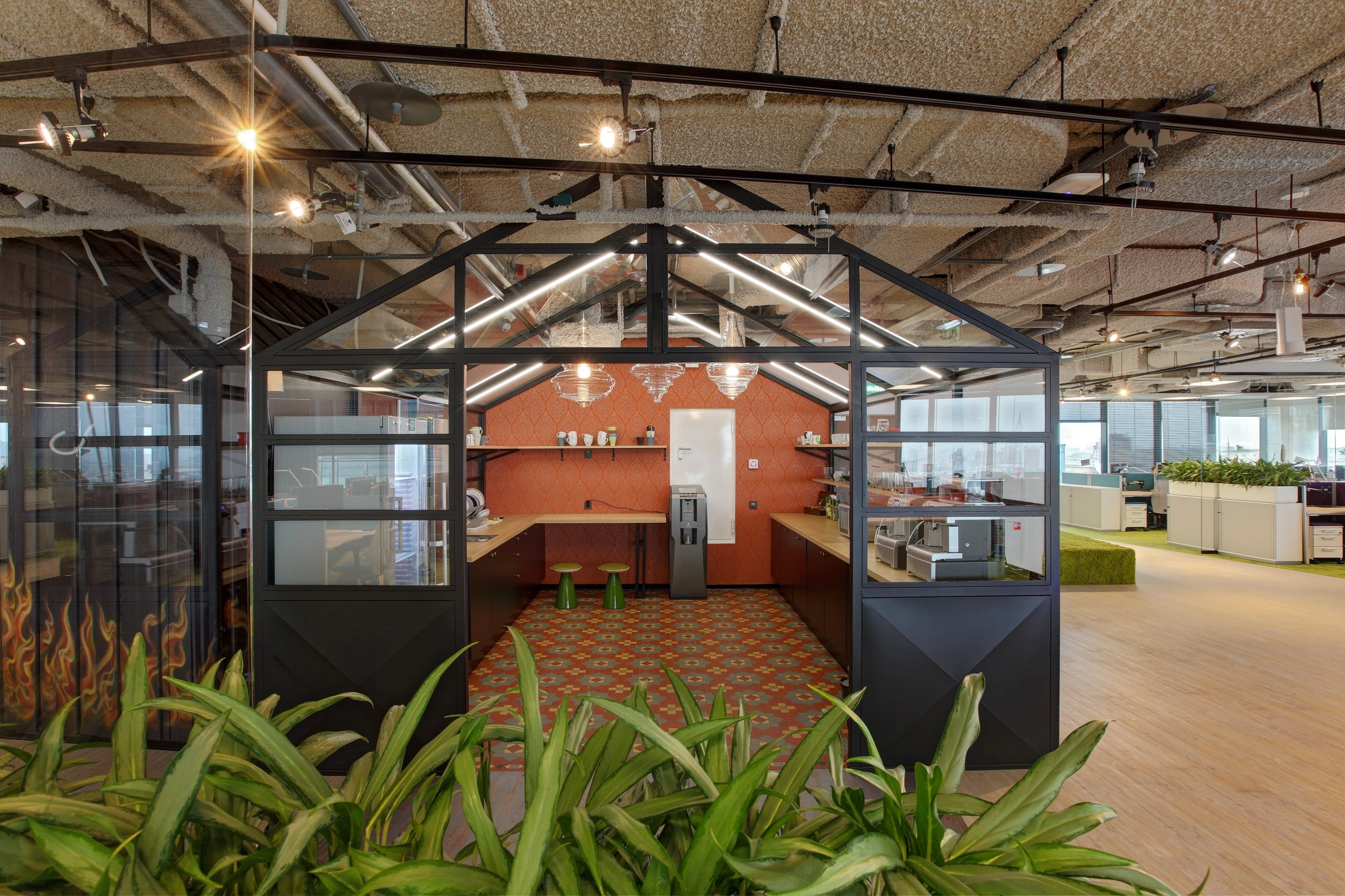 Сотрудники пользуются столовой зоной с доставкой готовых обедов и спортзалом на 13 этаже. В офисе есть выход на просторную террасу, которая стала дополнительным местом для общения и отдыха.