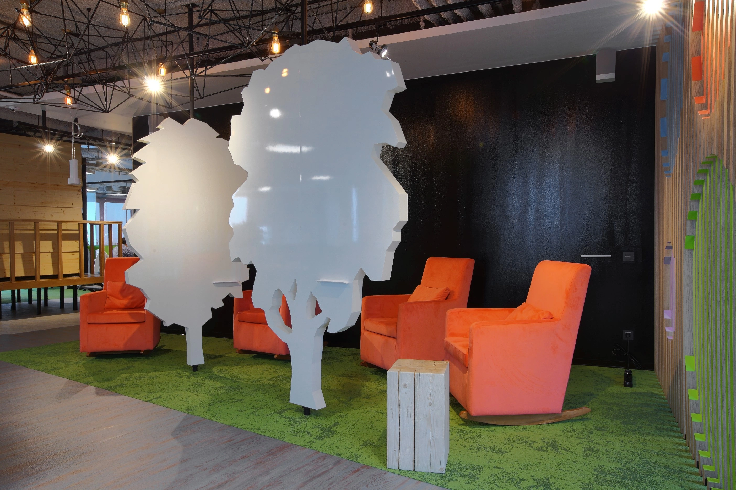 В самом дальнем углу офиса расположена зона неформального общения: мягкие кресла-качалки и стулья-барашки вокруг поворотных панелей-деревьев, которые являются маркерными досками. Черная стена, ограничивающая зону, также является маркерной.