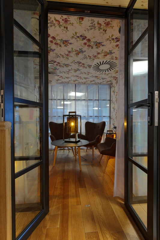Отдельное задание было на создание трех переговорных,  трансформируемых в одну большую. Она не должна была располагаться в транзитной зоне. Переговорную комнату разместили около второго входа в офис для быстрого доступа сотрудников с 13 этажа. Внутри переговорная выполнена в аналогичном стиле с офисом 13 этажа, снаружи - в деревенском для сохранения единообразия деревни.