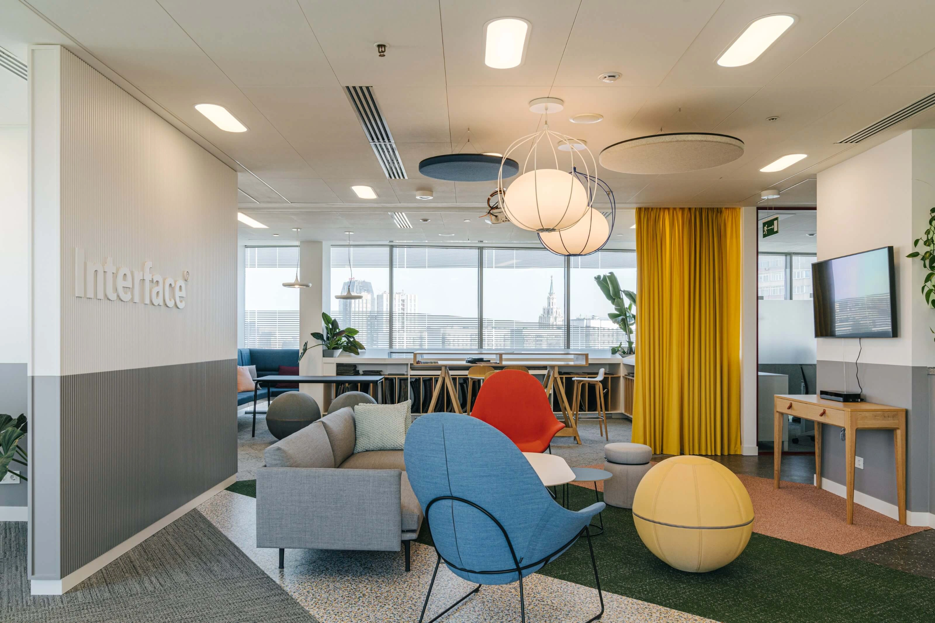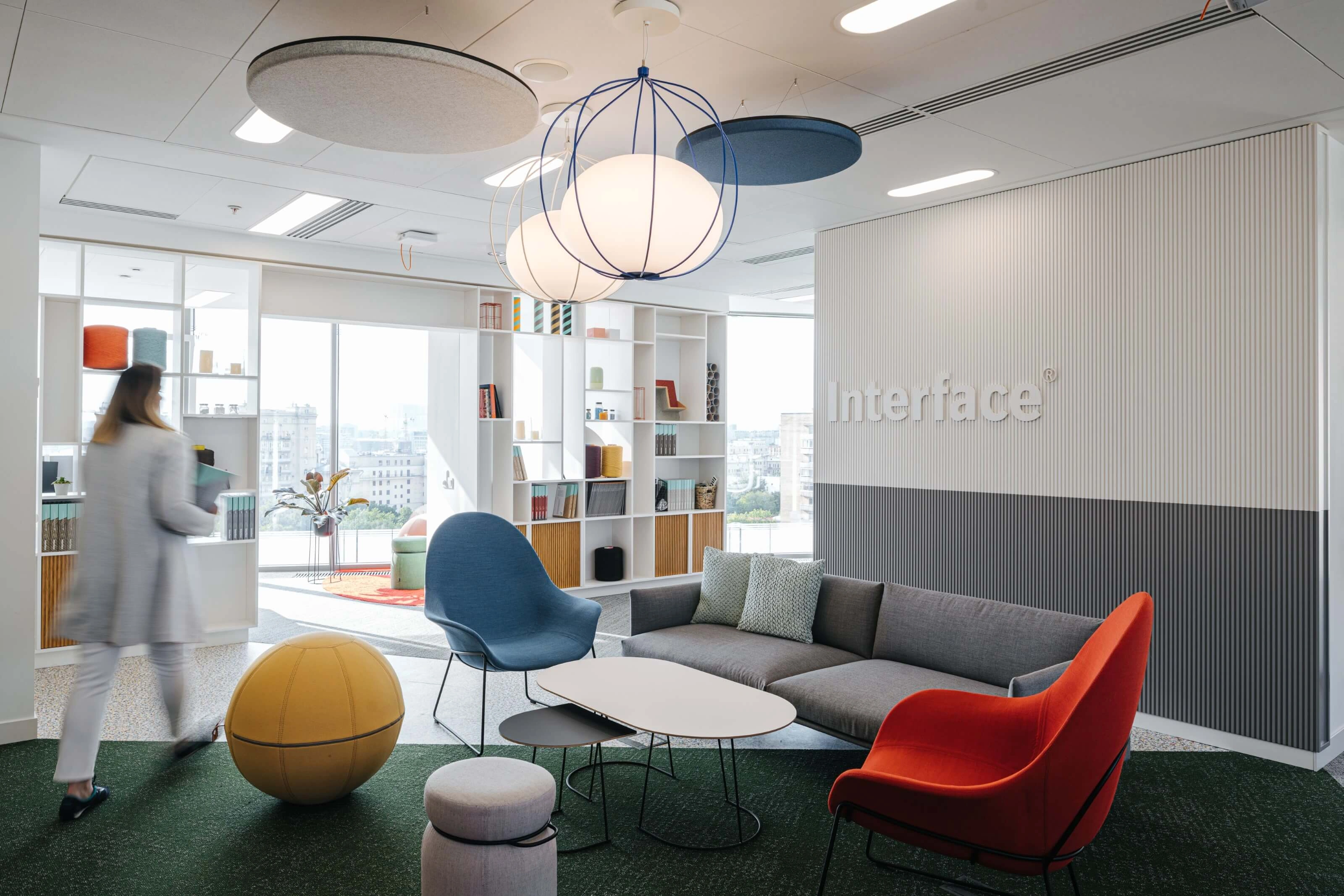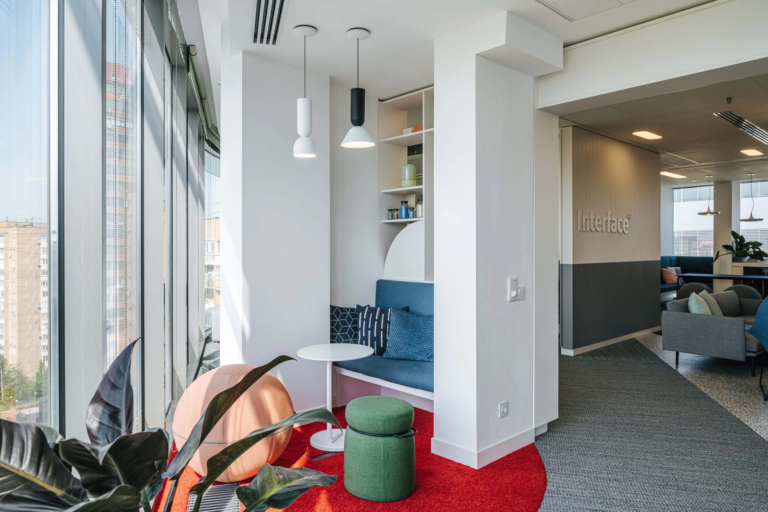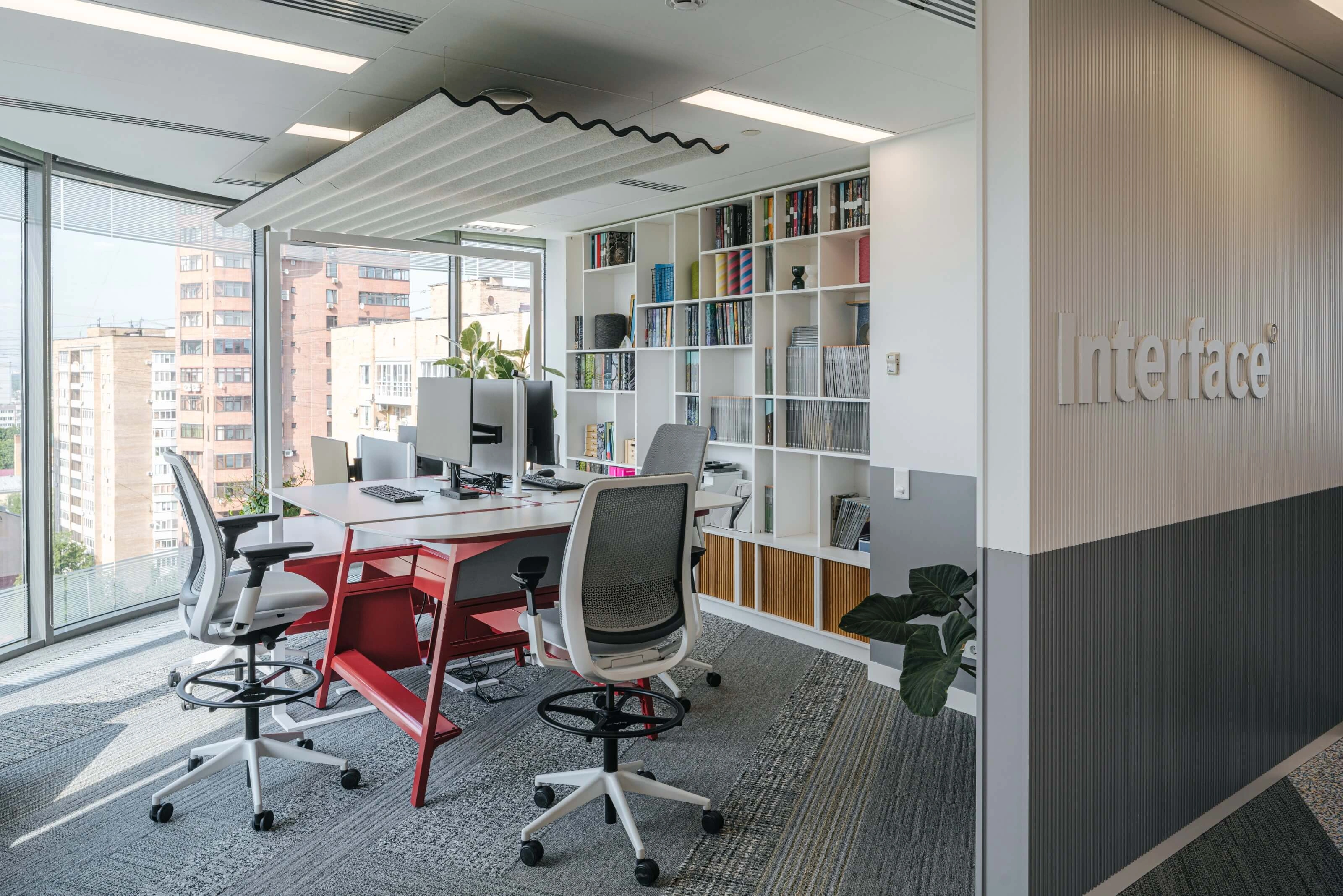 Пространство офиса пронизывают узоры разнообразных по цвету и текстуре напольных покрытий компании, объединяя весь интерьер в единое целое. В интерьере как элемент дизайна использованы цитаты основателя компании. В отдельных элементах интерьера использован красный цвет как отражение местного колорита (расположения офиса в России). В политике Интерфейса важное внимание уделяется экологии и здоровью, в том числе своих сотрудников. Поэтому в офисах компании по всему миру есть место занятиям спорту. В нашем компактном проекте это шведская стенка и фитболы, которыми может пользоваться любой желающий.