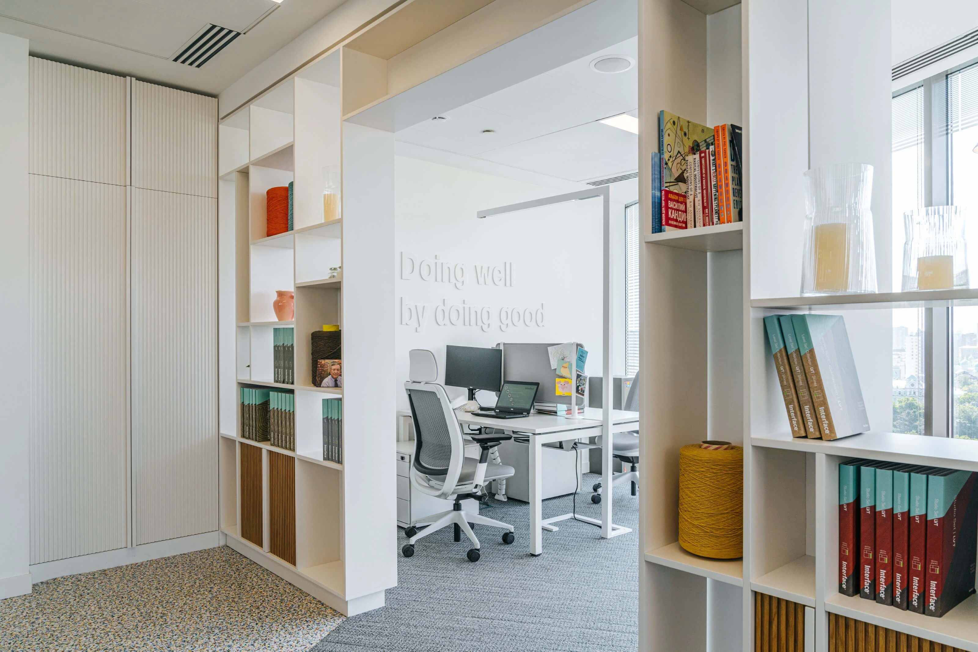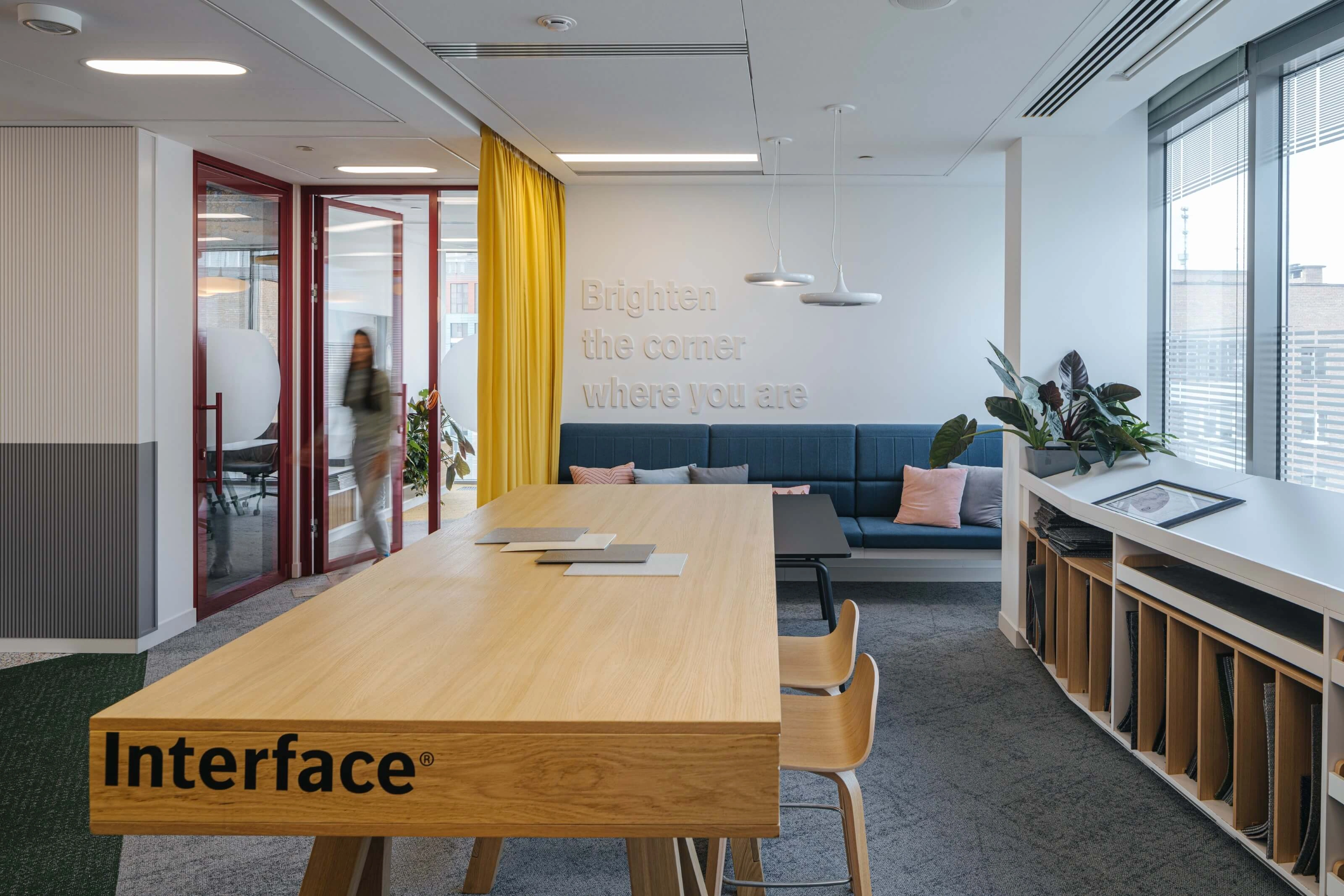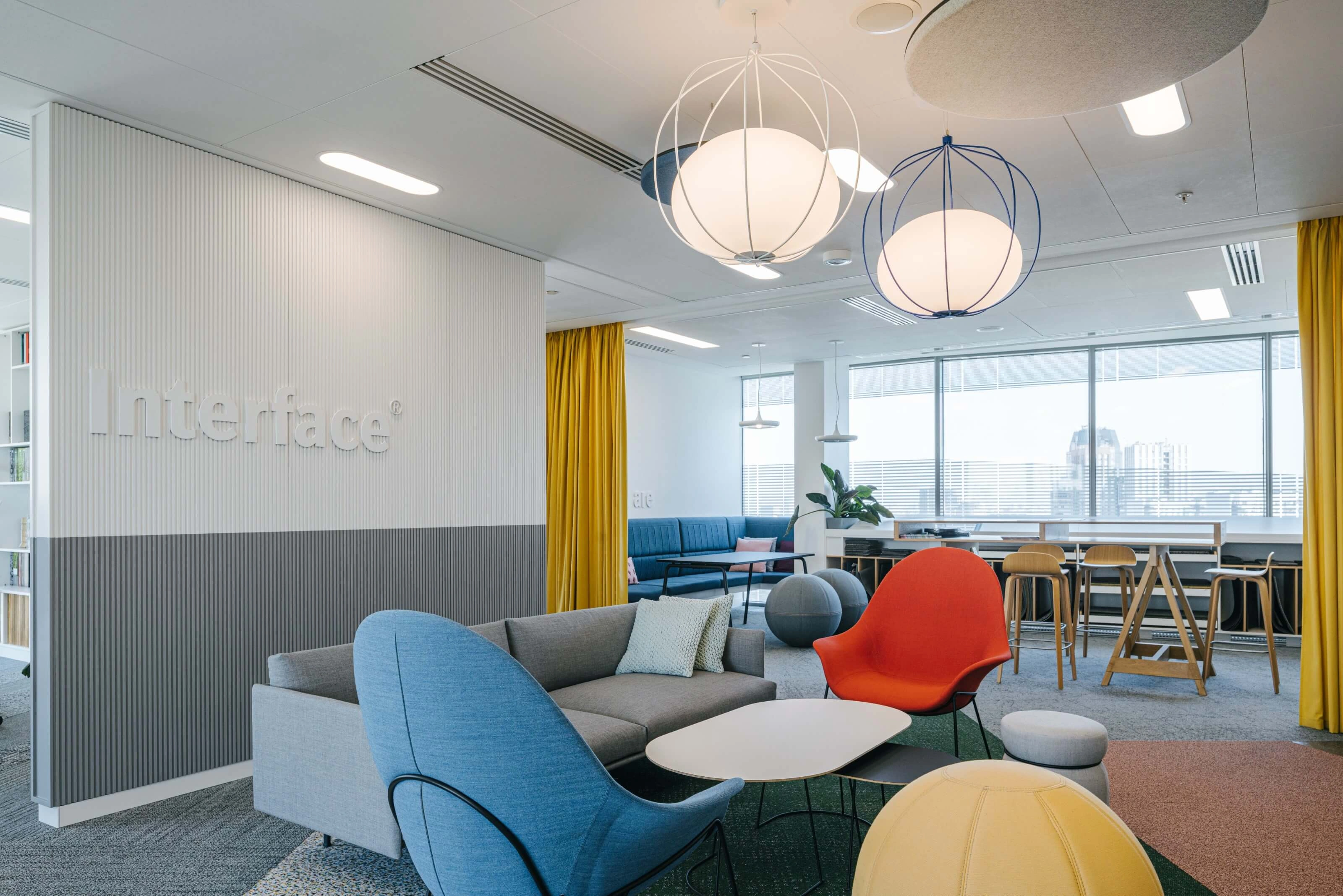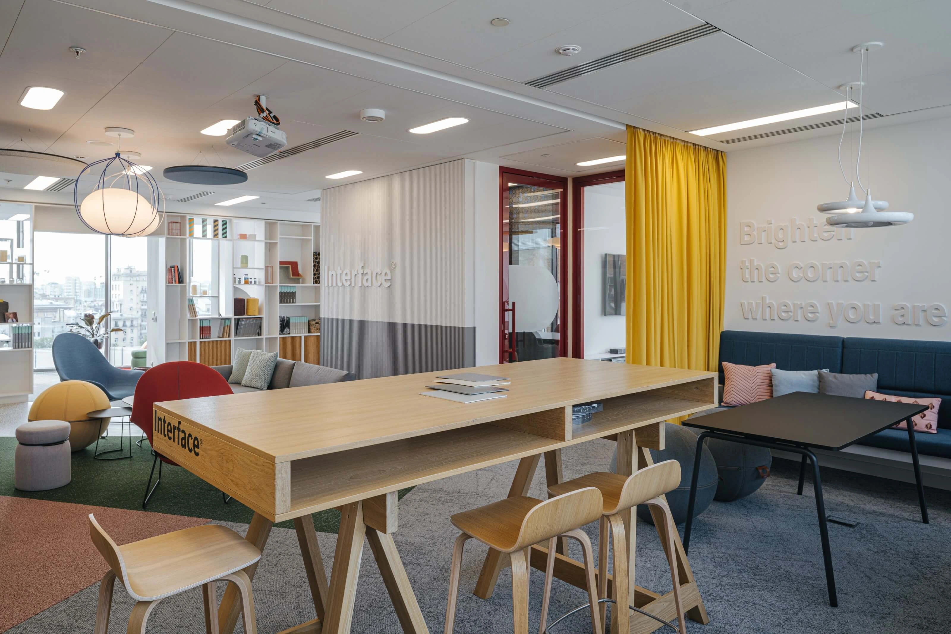 Пространство офиса пронизывают узоры разнообразных по цвету и текстуре напольных покрытий компании, объединяя весь интерьер в единое целое. В интерьере как элемент дизайна использованы цитаты основателя компании. В отдельных элементах интерьера использован красный цвет как отражение местного колорита (расположения офиса в России). В политике Интерфейса важное внимание уделяется экологии и здоровью, в том числе своих сотрудников. Поэтому в офисах компании по всему миру есть место занятиям спорту. В нашем компактном проекте это шведская стенка и фитболы, которыми может пользоваться любой желающий.