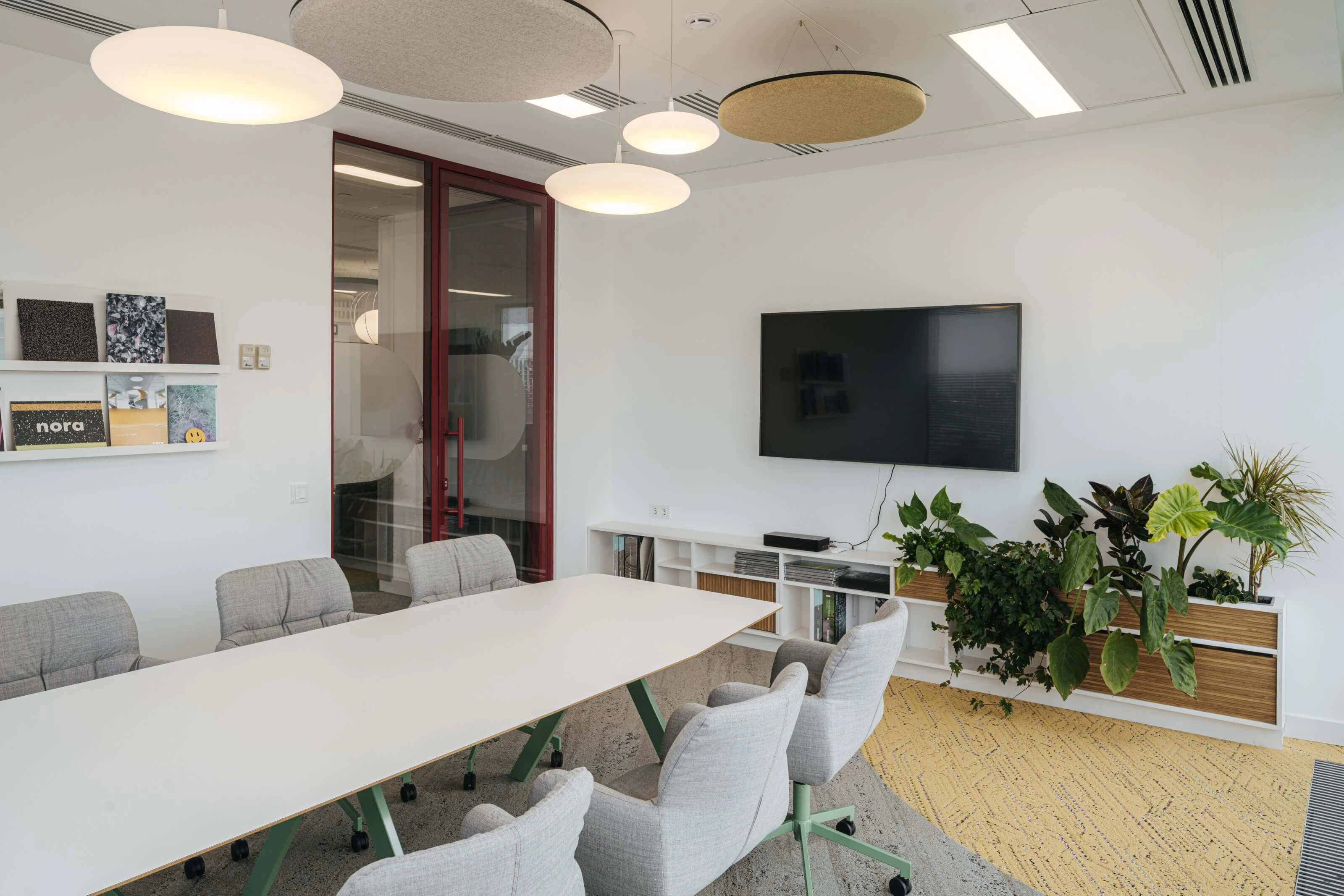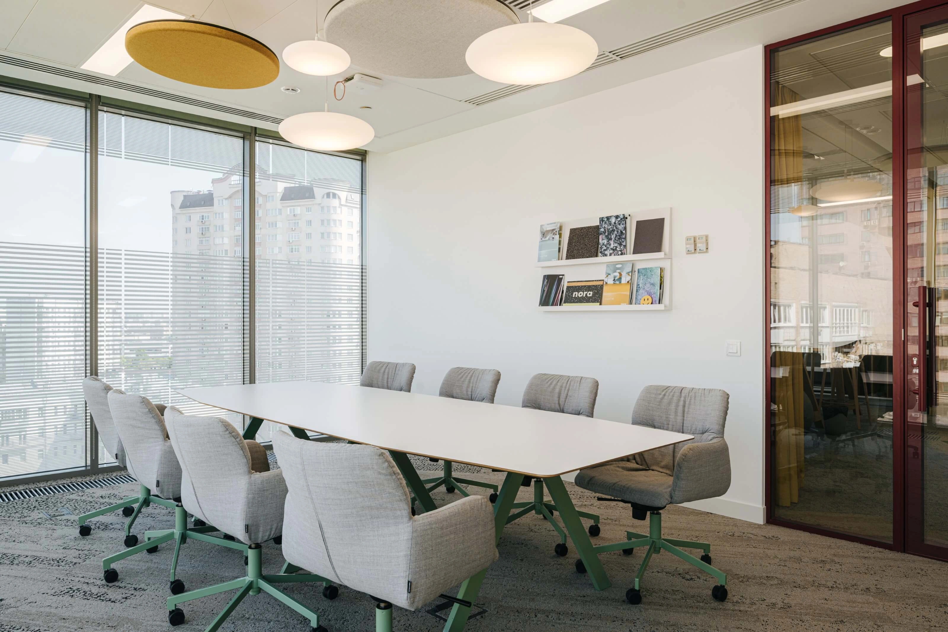 Переговорная комната оснащена видео и аудио оборудованием для международных или внутренних встреч, а также акустическими подвесными панелями. В мебель встроены элементы озеленения.