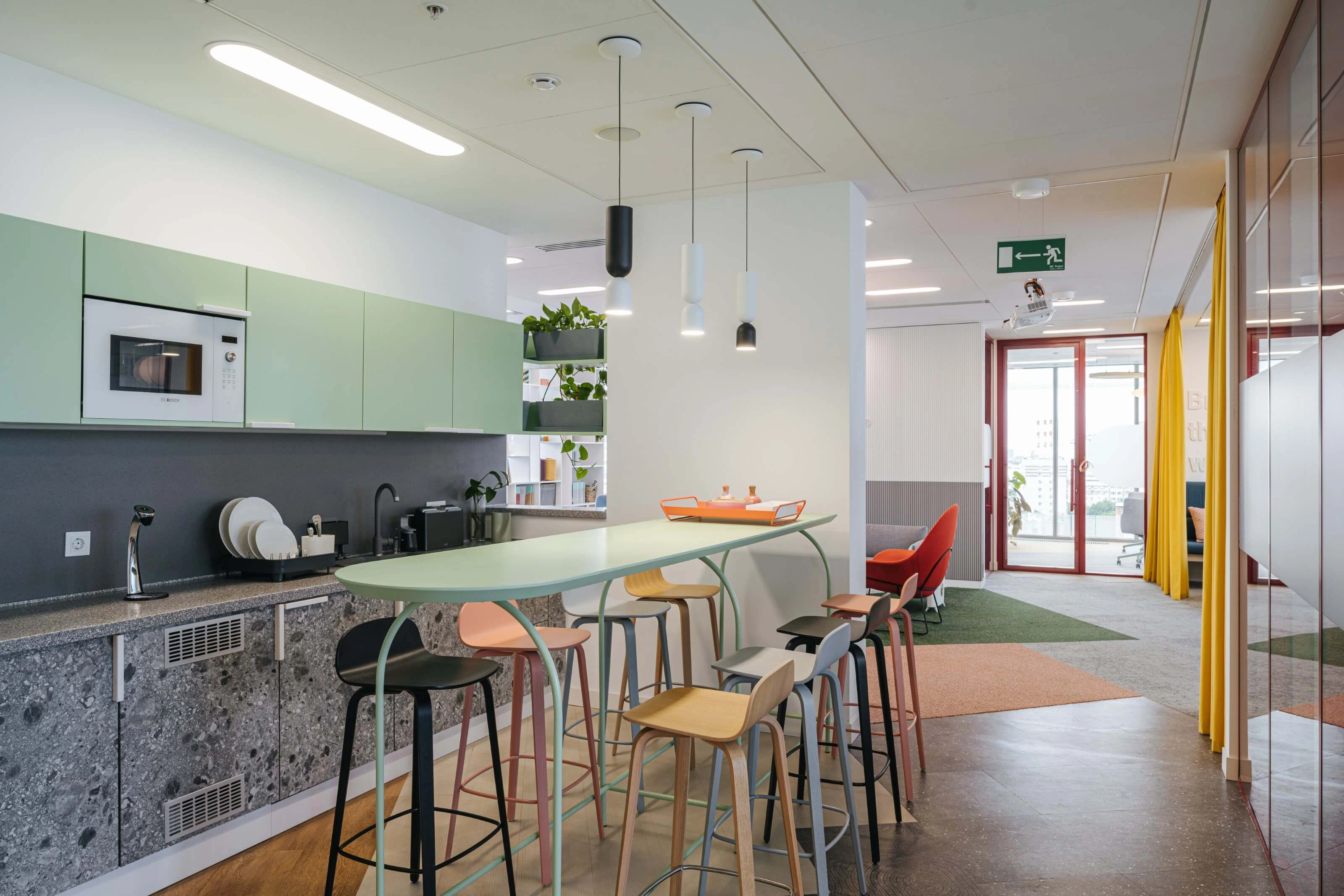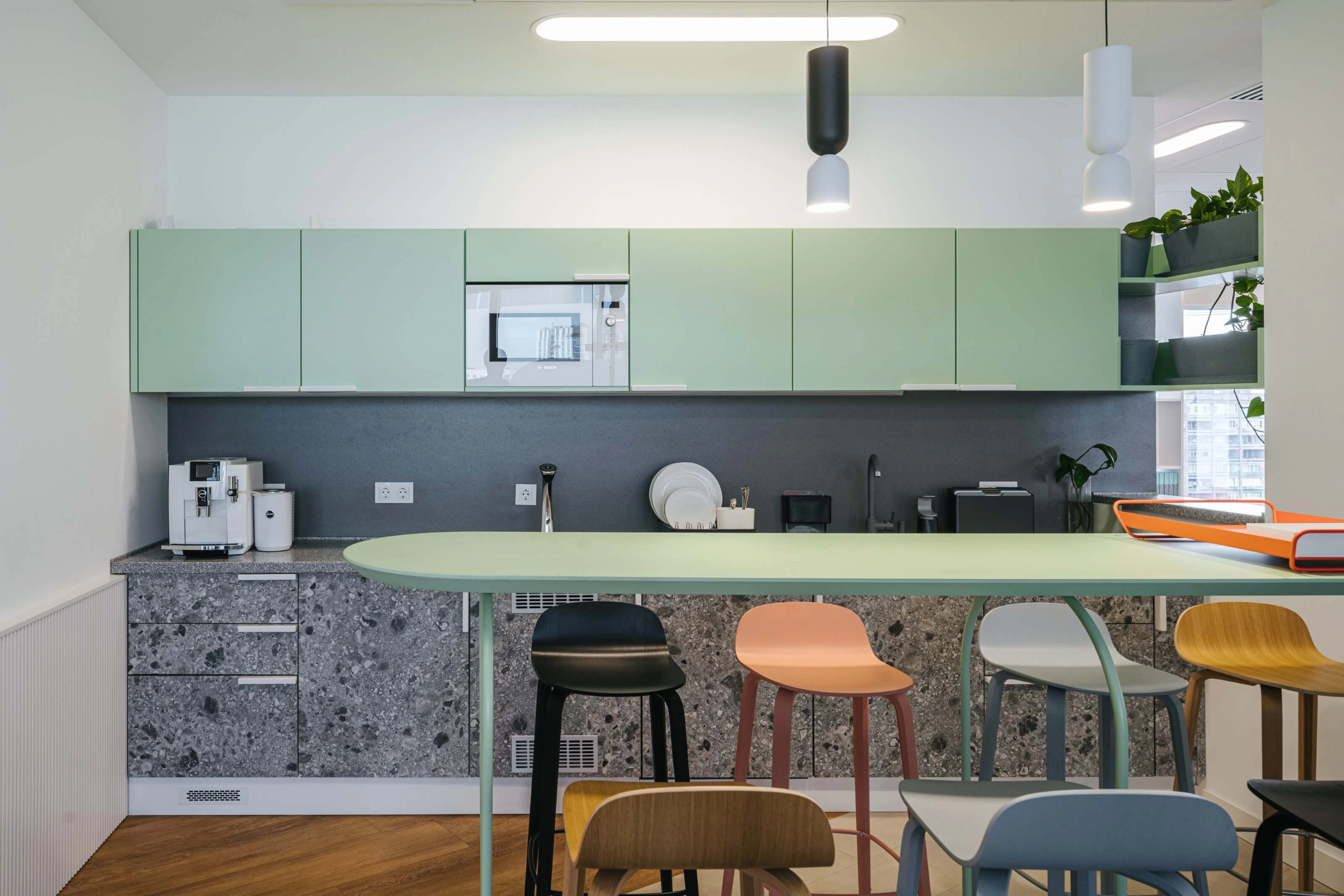 Далее пространство плавно перетекает в кухню. Тут все максимально технологично и экологично для нужд сотрудников и посетителей. В том числе кашпо с растениями, где предполагается выращивать свои пряности или салаты. Оформление кухни в мятно-нежном настроении несколько отличается от всего офиса для возможности переключения и отдыха. Для фартука кухни в том числе использована продукция компании.