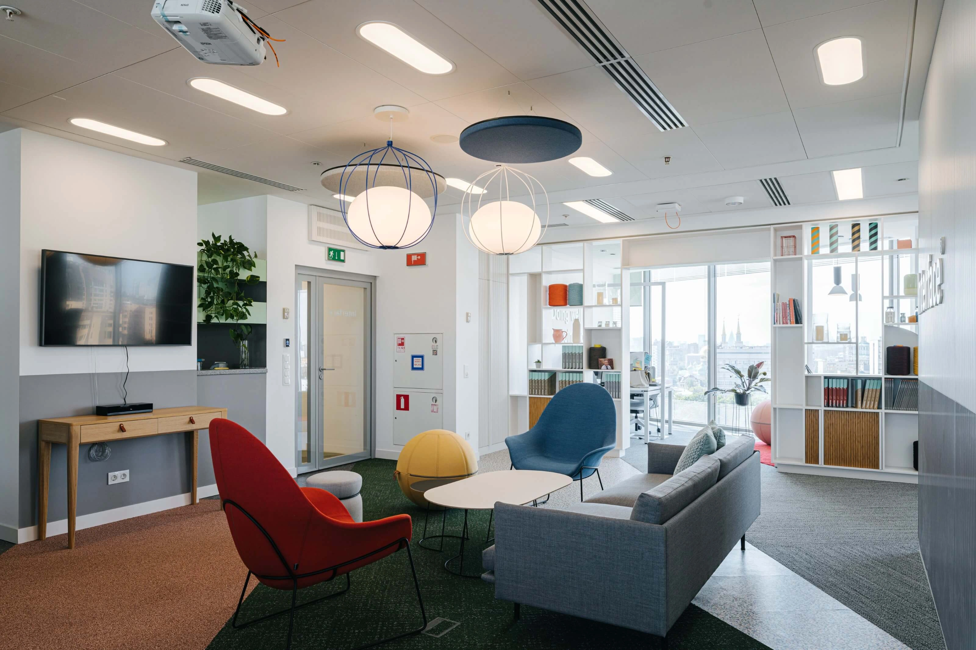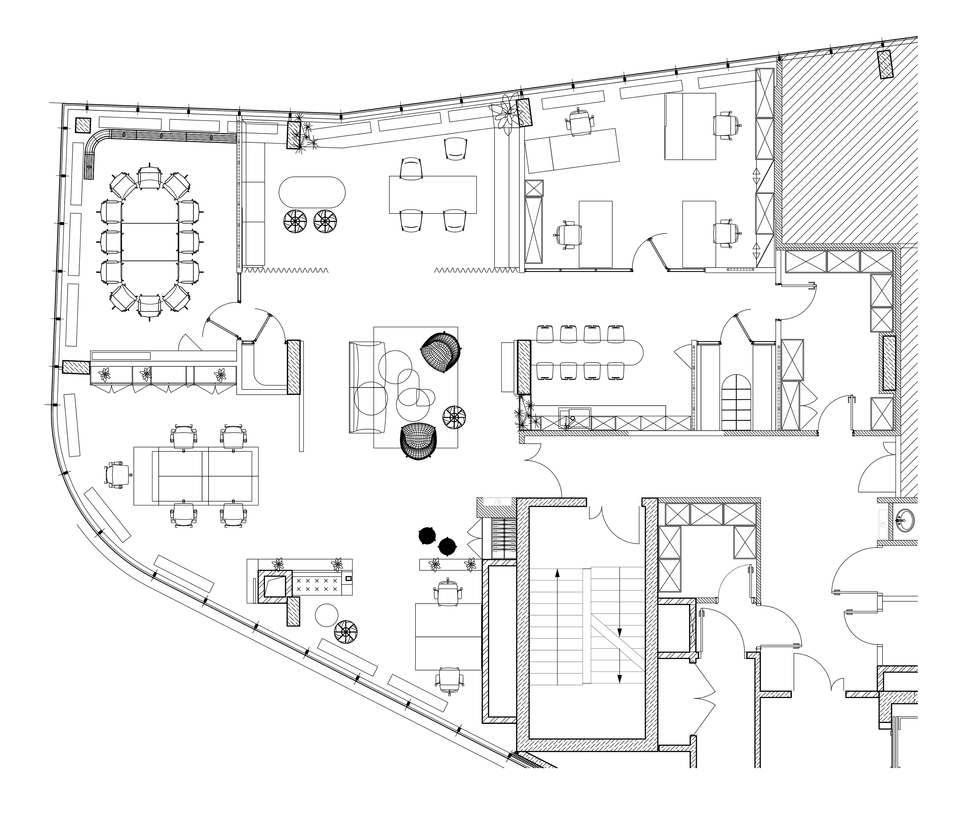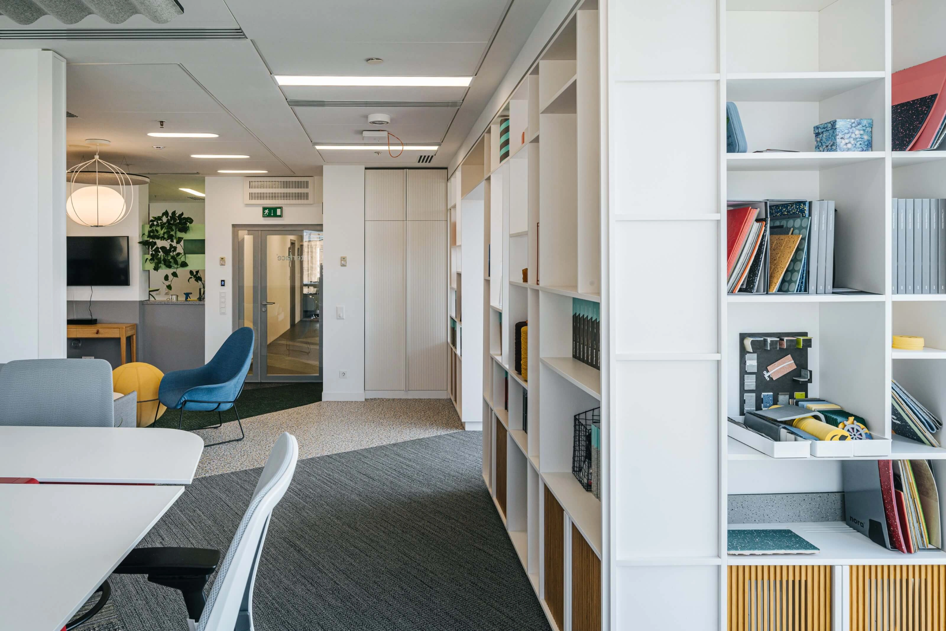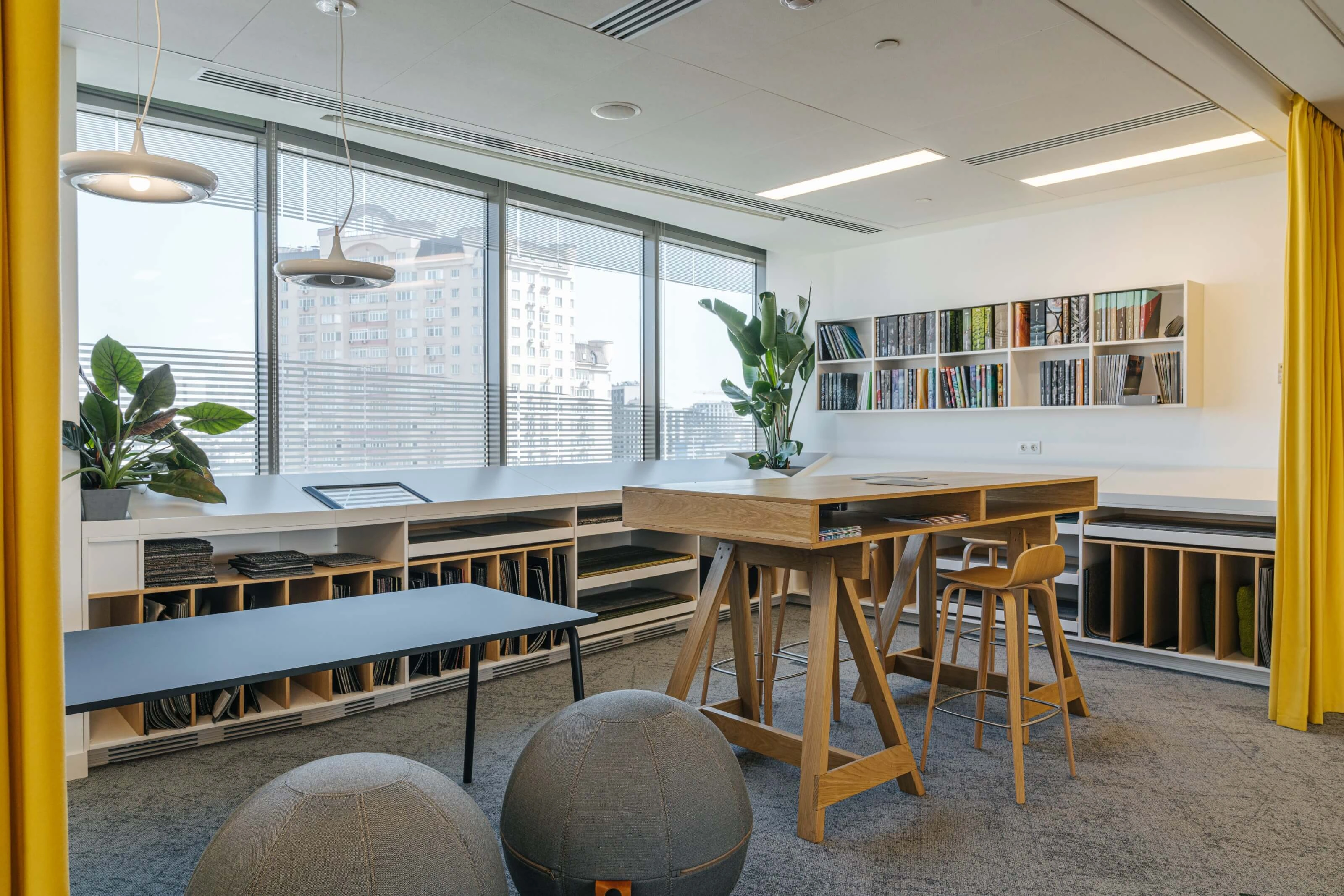 К “гостиной” примыкают две рабочие зоны с различными типами столов и кресел по высоте и оборудованию для реализации девиза компании “свободный выбор рабочего места”. Они оснащены искусственным освещением с датчиками присутствия и освещенности, акустическими элементами, озеленением и стеллажами для хранения каталогов. Открытое пространство отделено от рабочего полупрозрачными перегородками из стеллажей с элементами бренда и материалами компании.