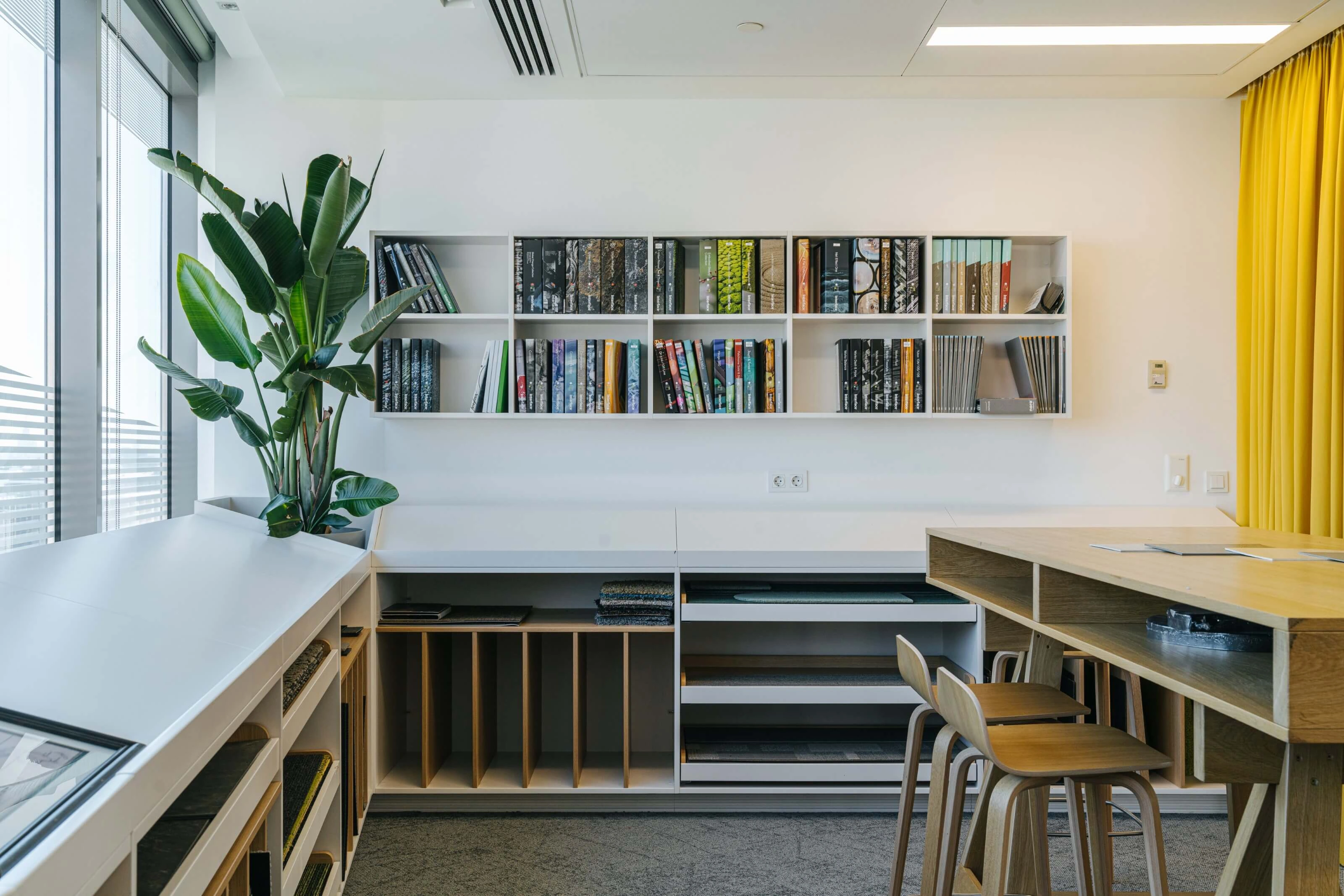 За “гостиной” следует пространство “воркшопа”, место для демонстрации, творчества и игры с материалом. Здесь расположены стеллажи с образцами материалов и каталогами, а также максимум поверхностей для работы с ними. Важно было создать места для работы и общения стоя, сидя или даже лежа ?. Пространство “воркшопа” при необходимости отделяется от “гостиной” акустическими шторами. Предусмотрен экран и проектор для мероприятий в общем пространстве или в “воркшопе” в отдельности.