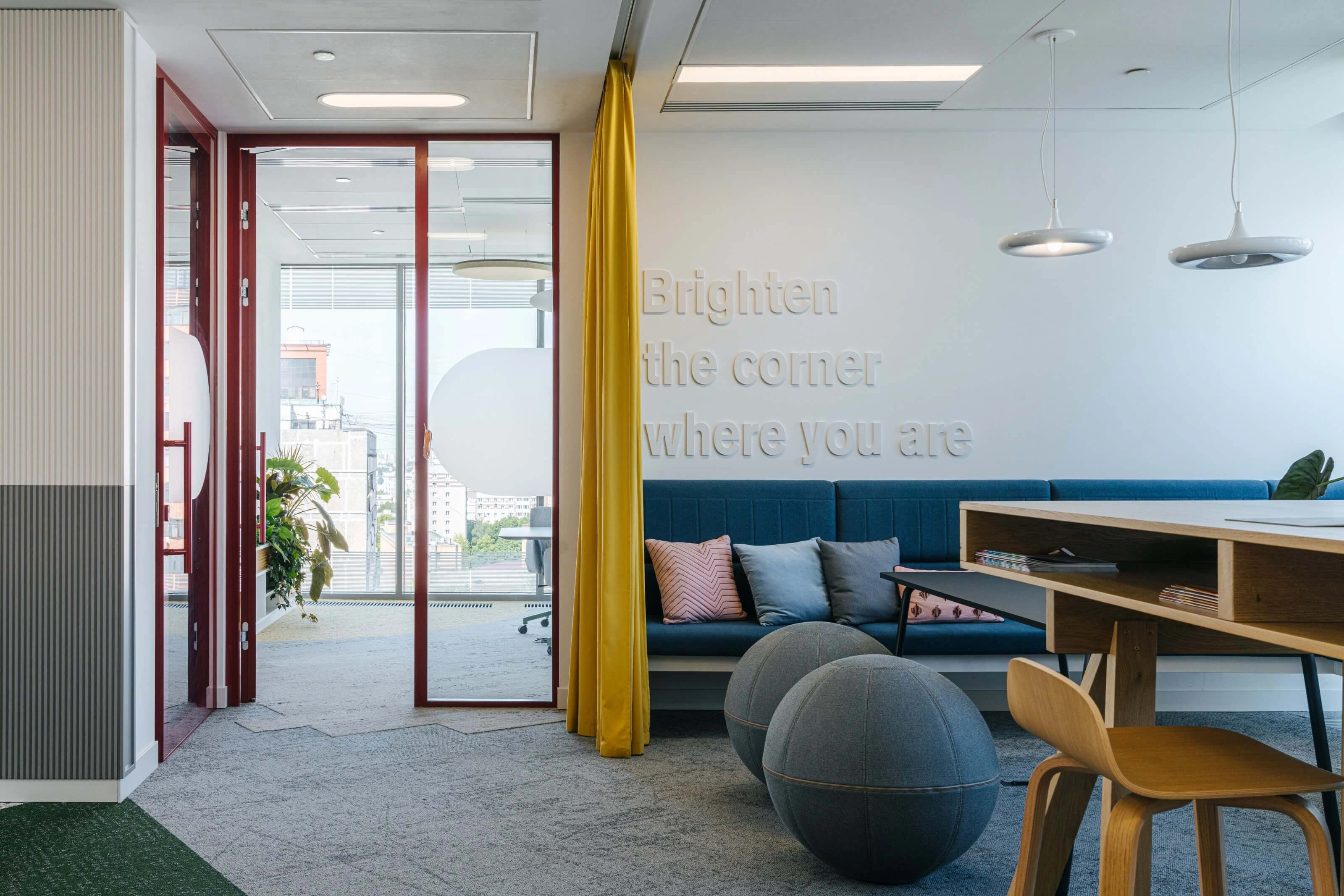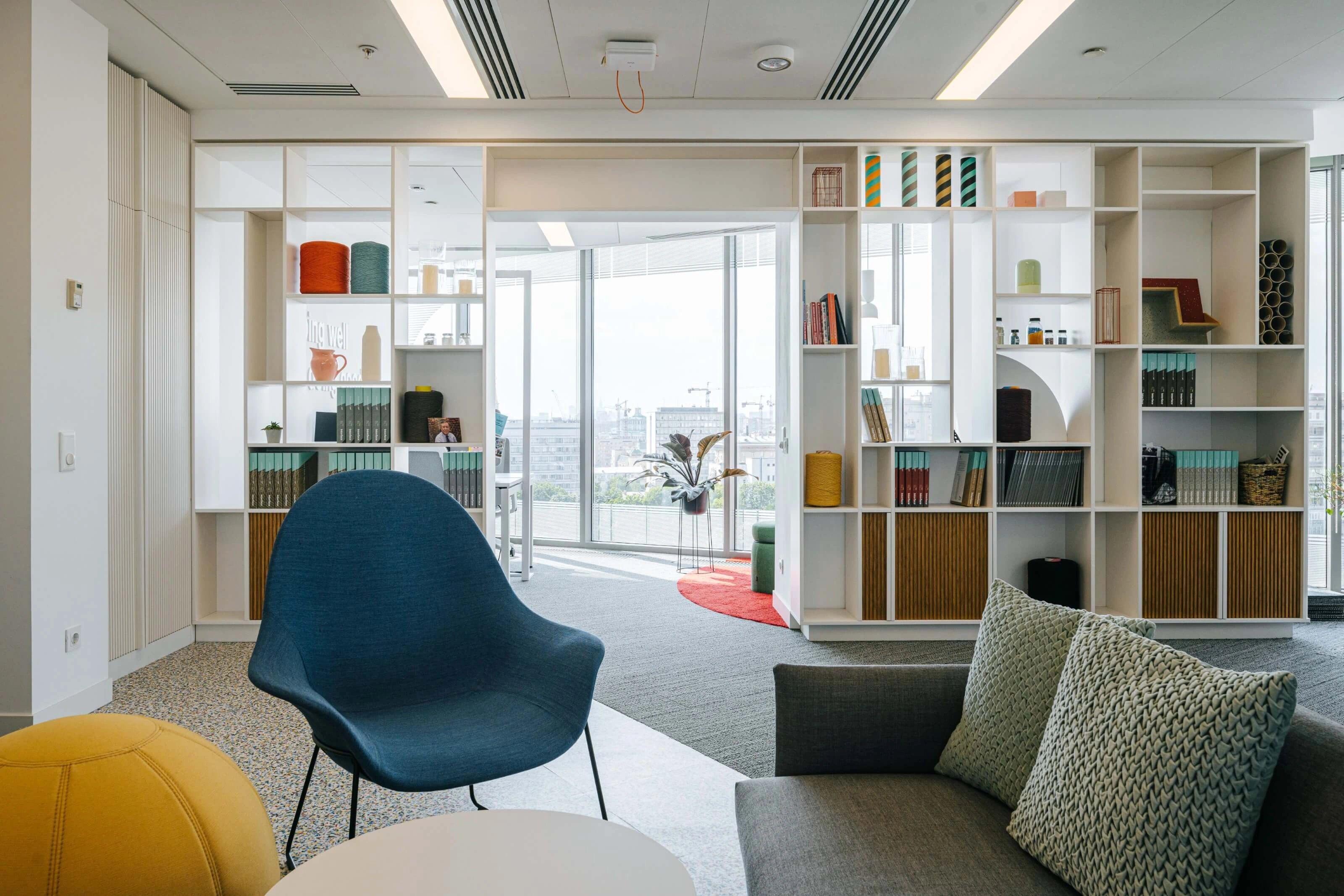 Телефонная будка и мини-переговорная отделана по всему периметру материалами бренда, которые используются как акустический материал. А мебель специально разработана для удобства работы с каталогами и материалами. Цветовая гамма отвечает гамме всего офиса.