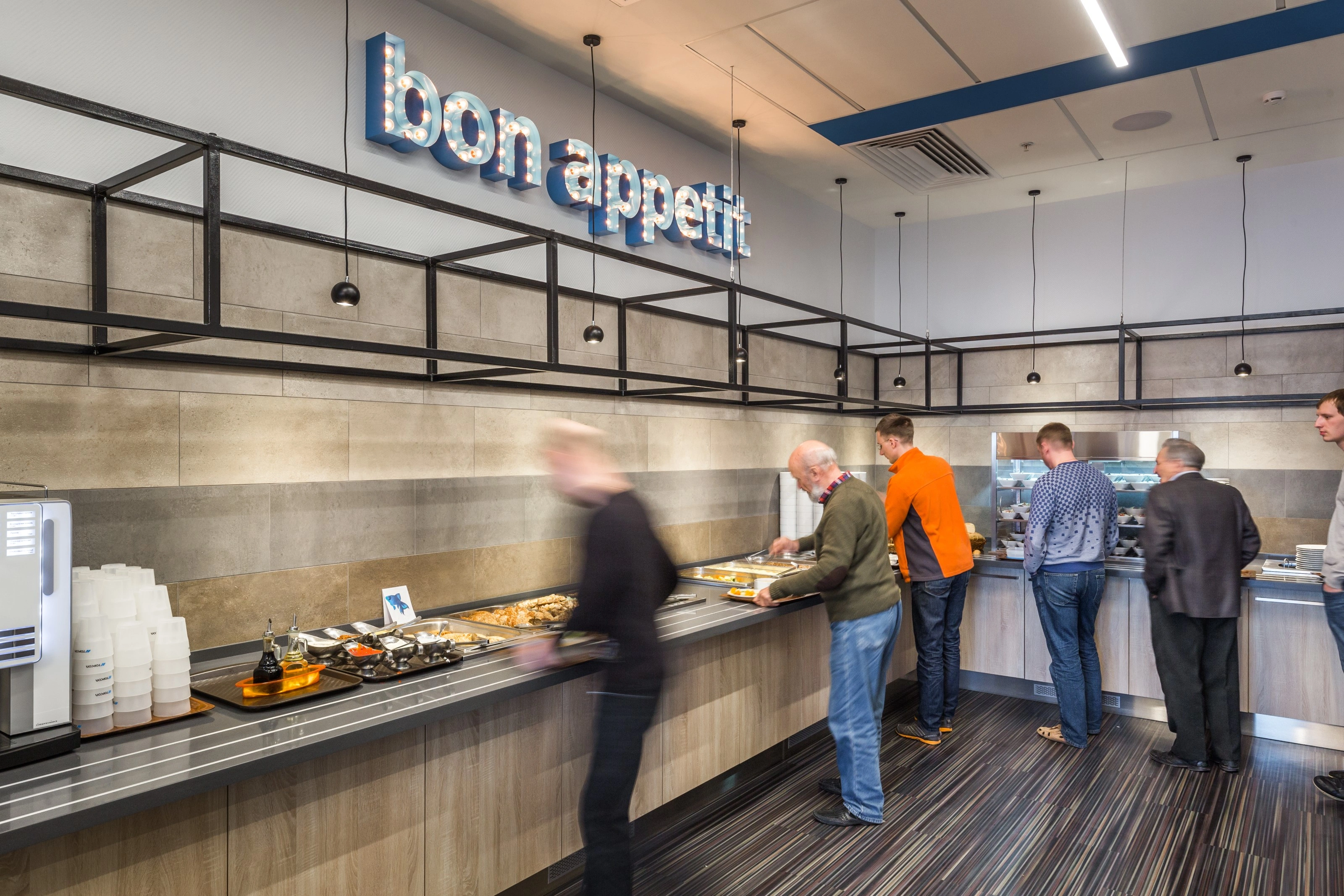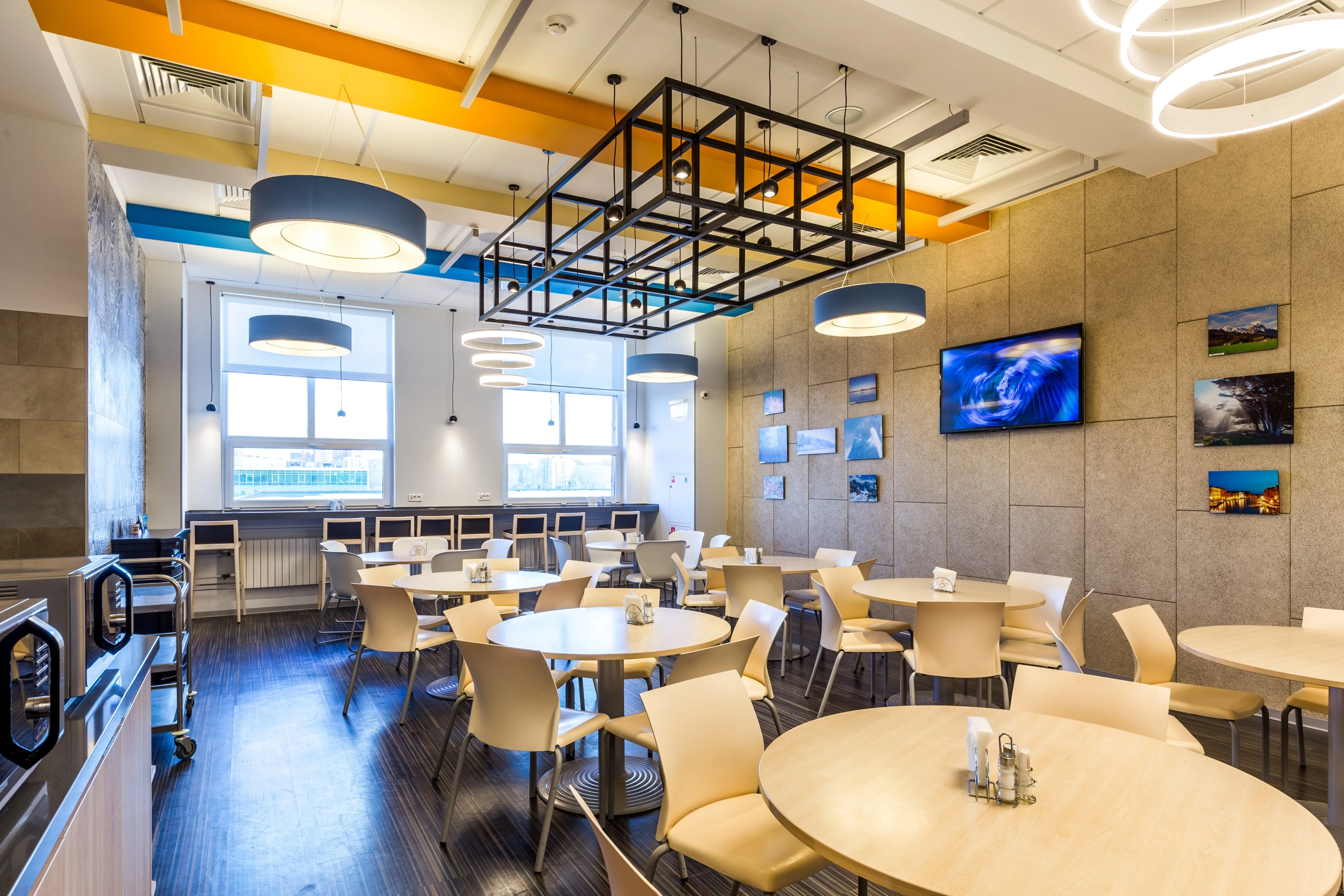 Отдельное внимание было уделено акустическому комфорту. Мы использовали качественные потолки из минеральной плиты, звукополгощающий винил в проход, звукопоглощающие панели на стенах.