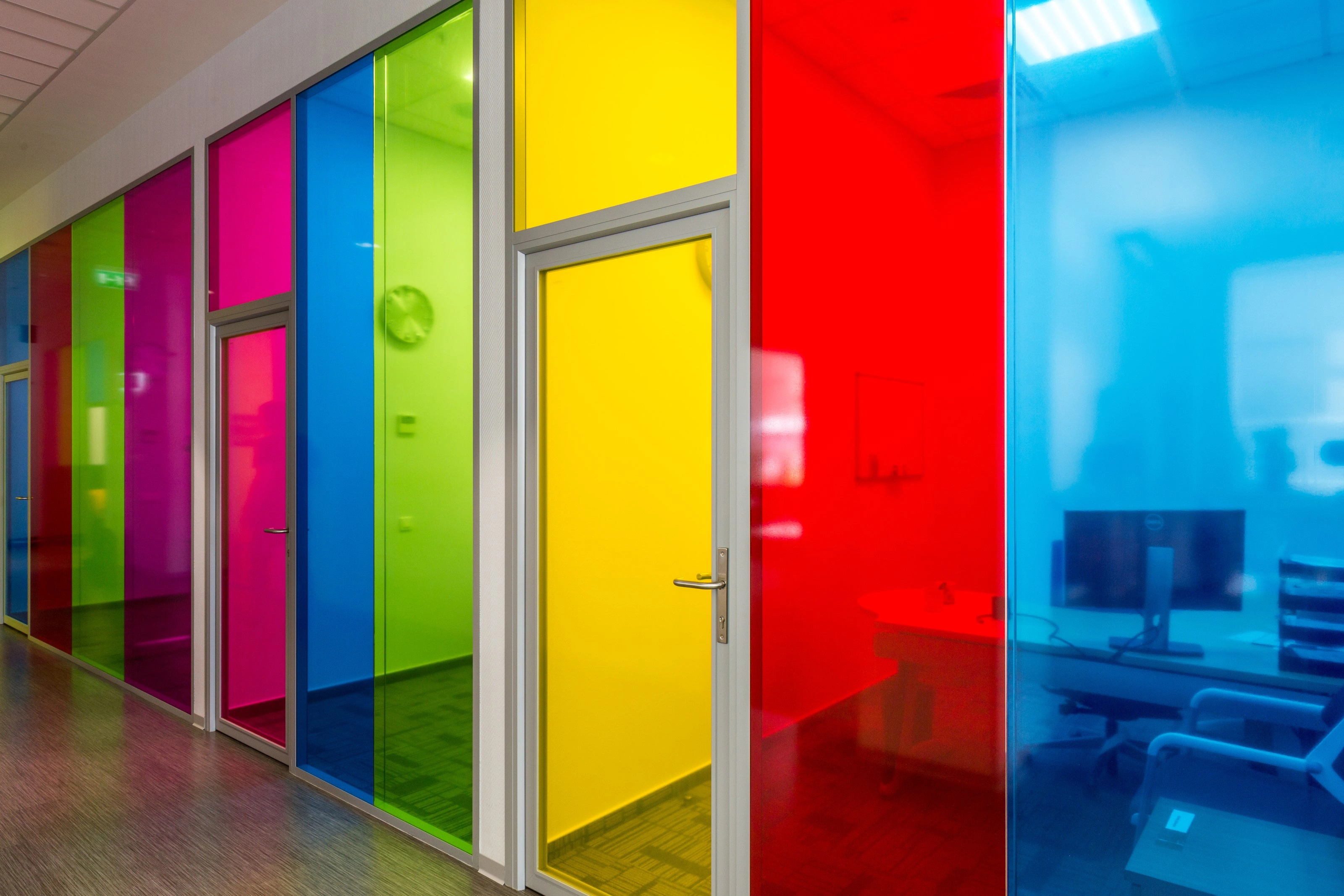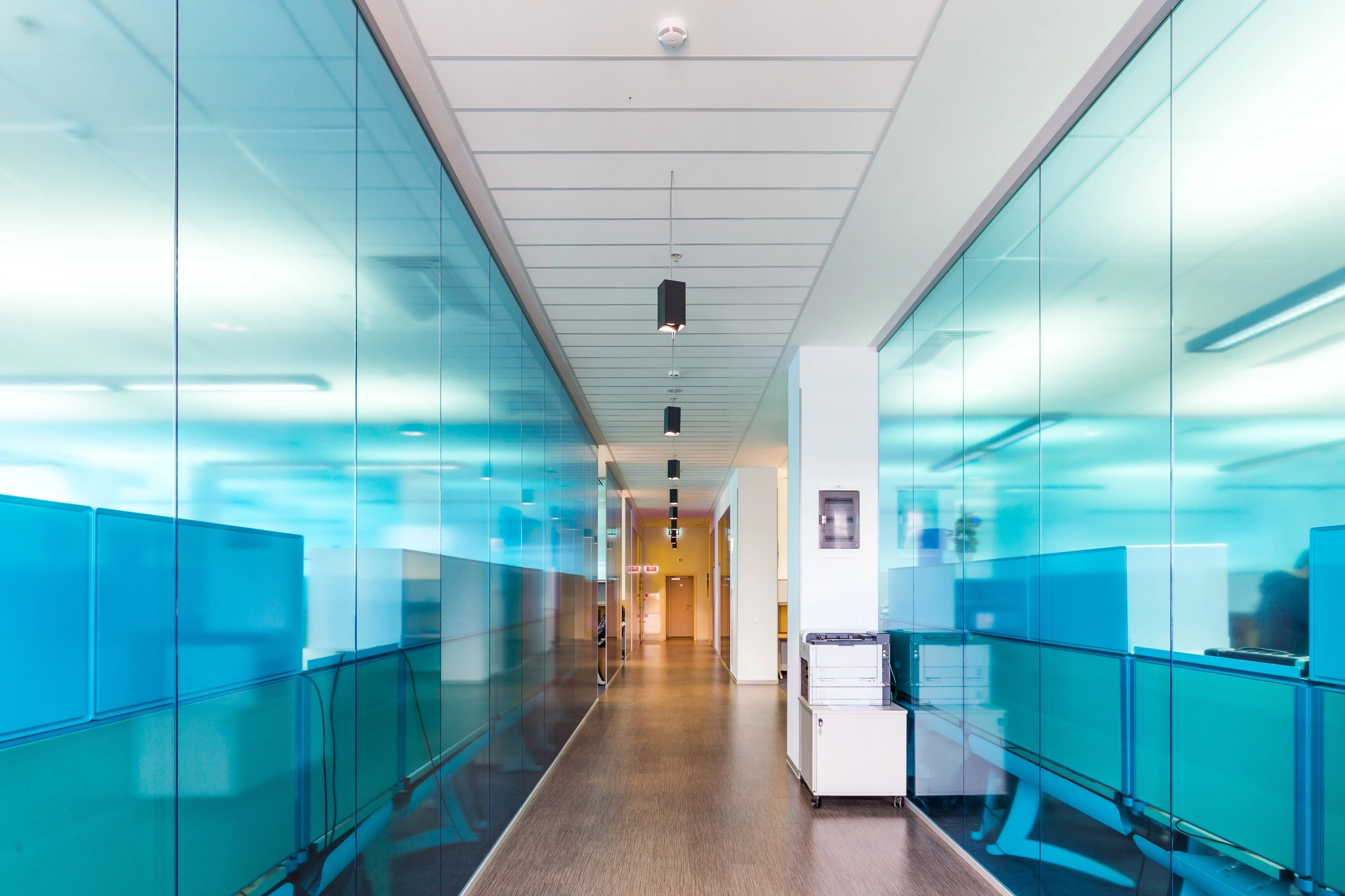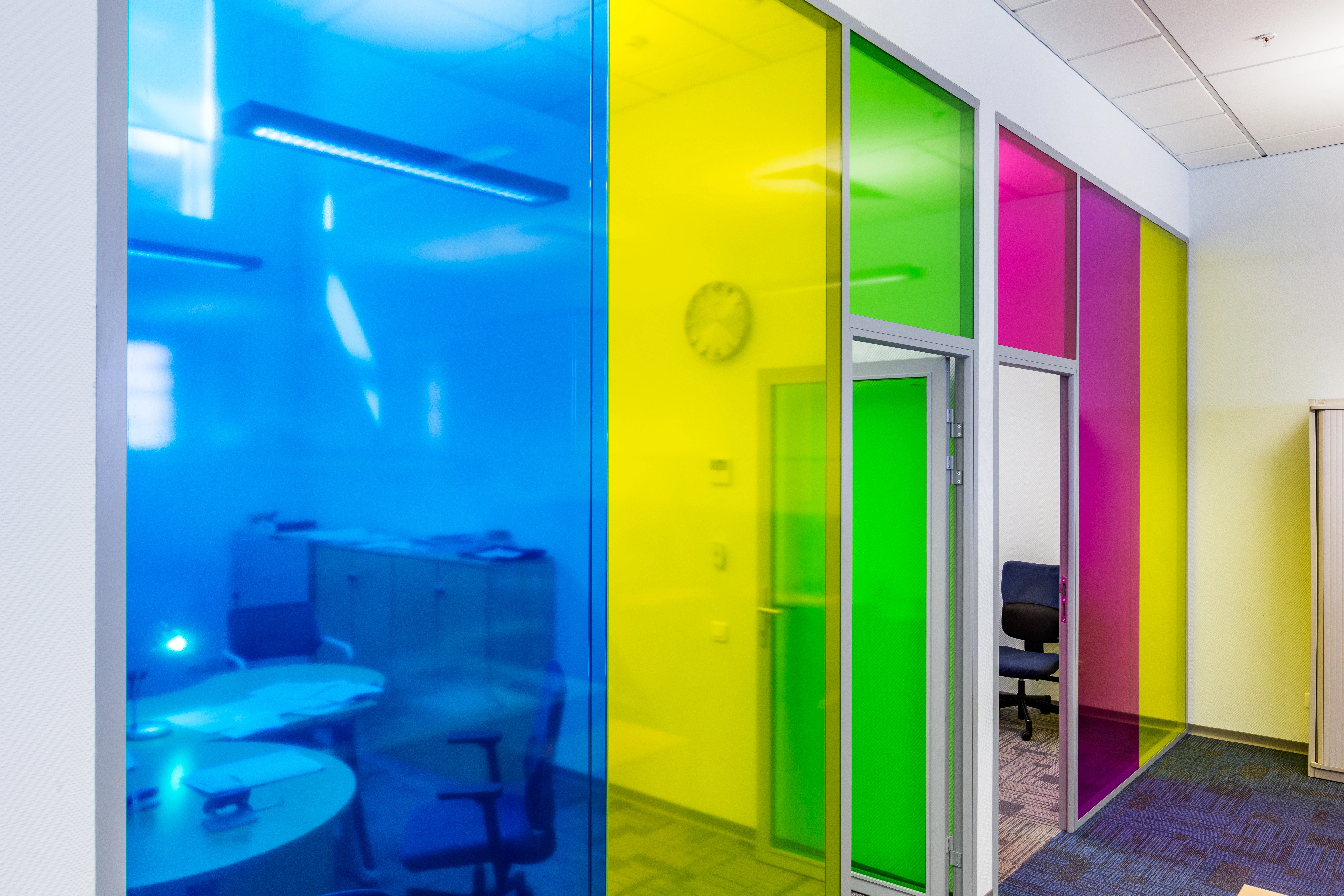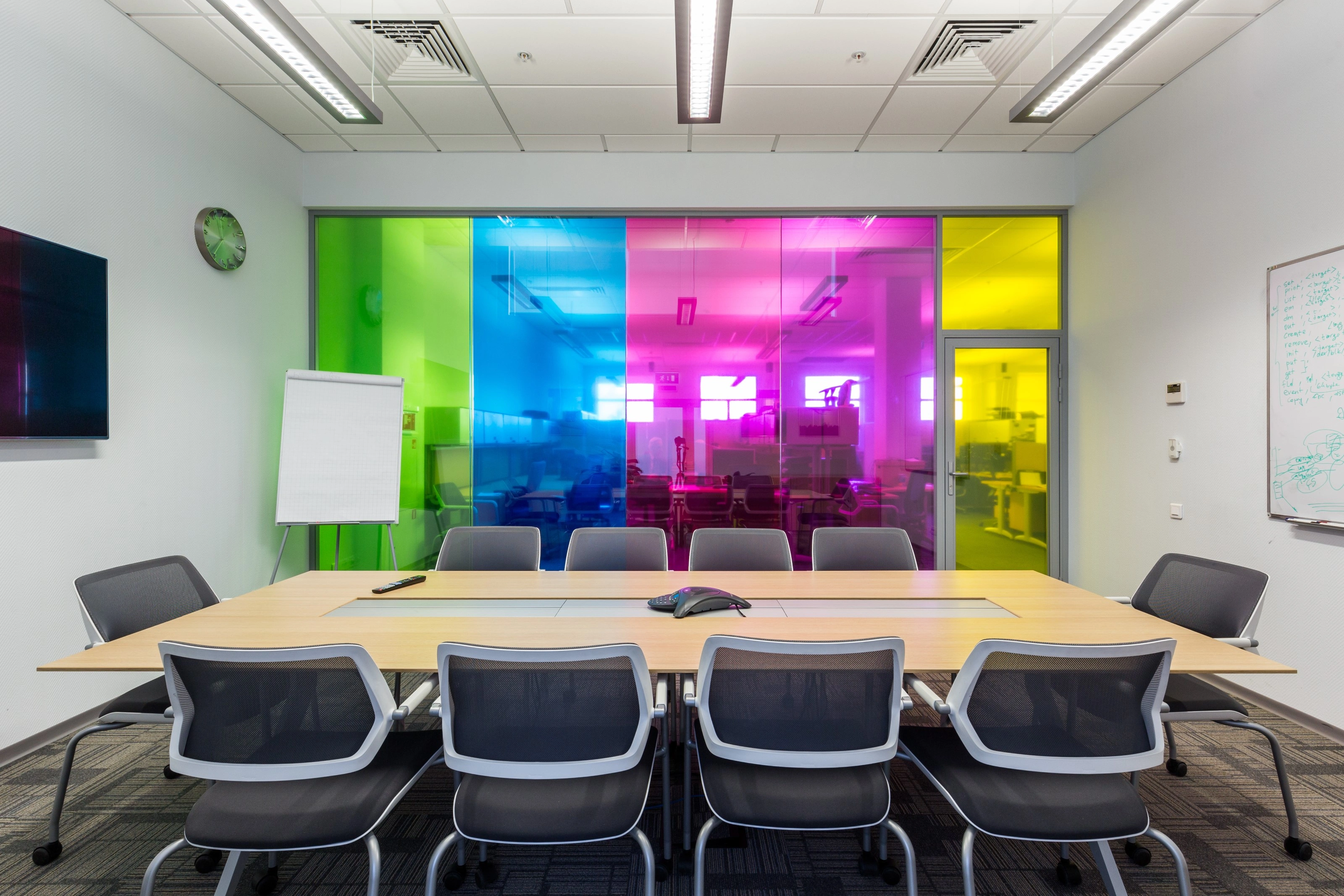 Базовая концепция, которую мы активно пропагандируем - максимально светлое чистое пространство, комфортное и не отвлекающее сотрудников. Чтобы сделать работу команд более спокойной, открытые пространства разделены стеклянными перегородками на небольшие отделы - по 12-16 человек. Индивидуальность достигается использованием цветной светопрозрачной пленки на перегородках.